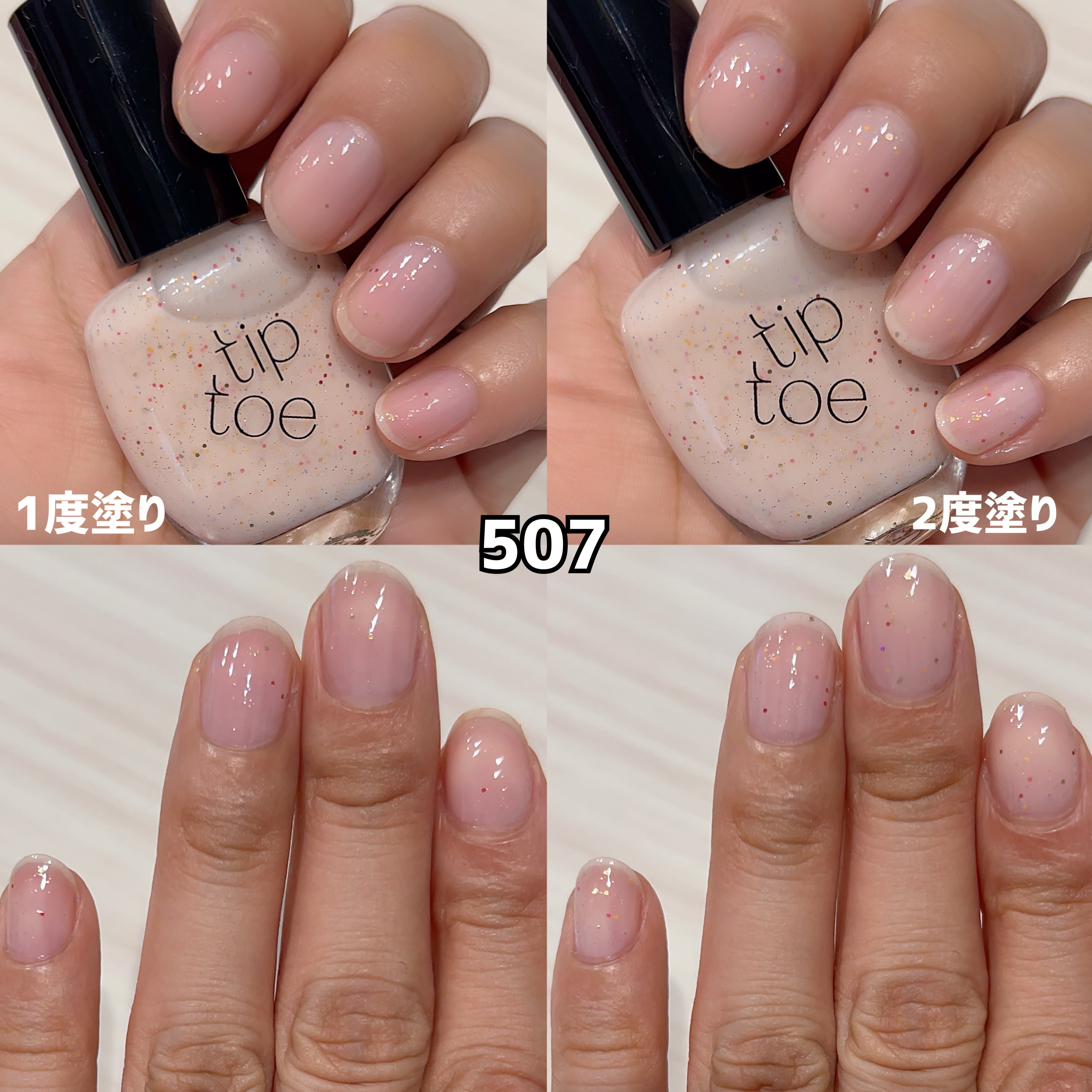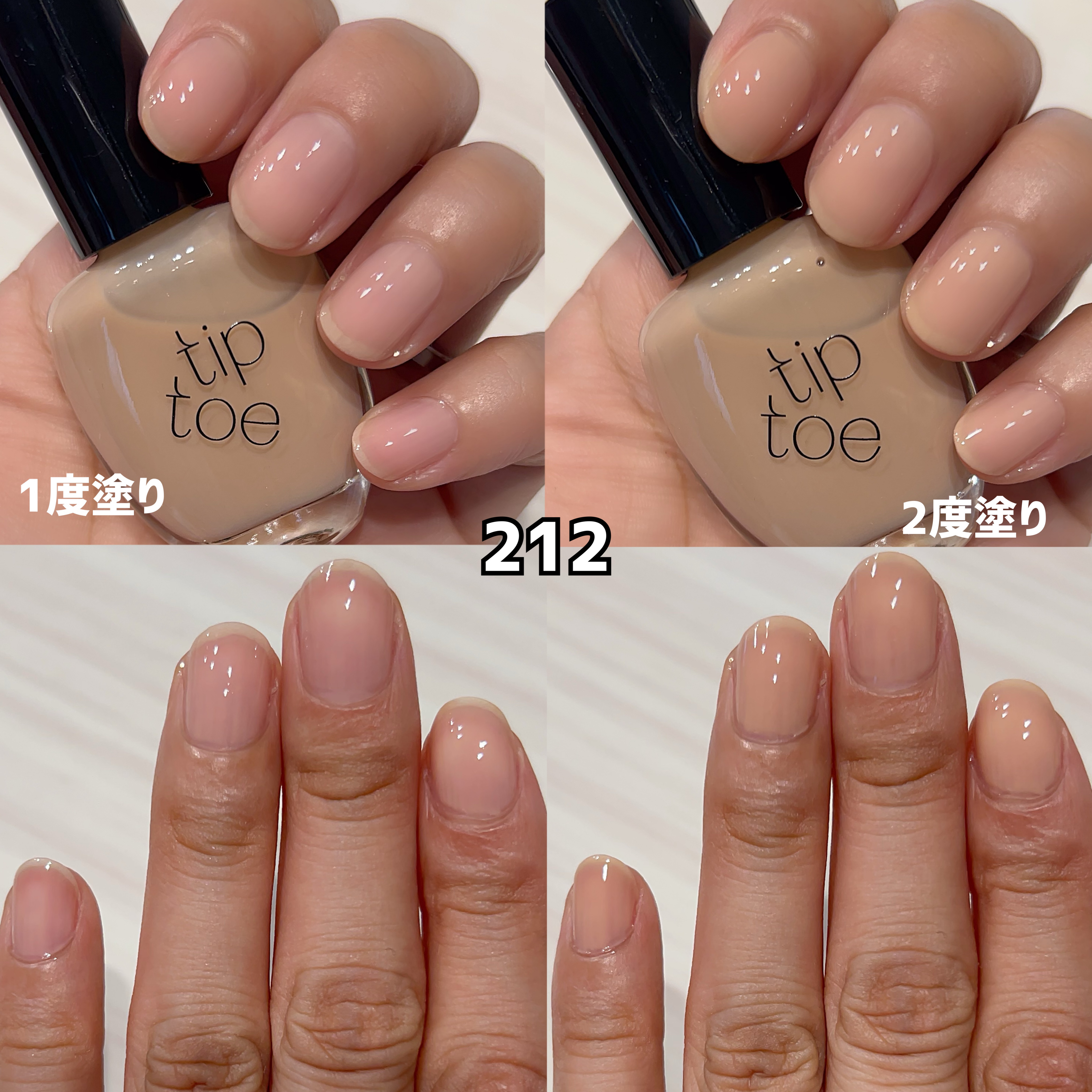 シロップのような透け感のあるネイル ティップトウシロップ&グリッターネイル💅 212 ヌガーベージュ 指が長く見えるようなクラシックカラー ミルキーなベージュでナチュラルな仕上がりに。 502 タンゴ&ワルツ ブリックレッドにカラフルなドットグリッター 一見派手に見えるけどグリッターの乗せ方で表情の変わるオシャレなデザインに。