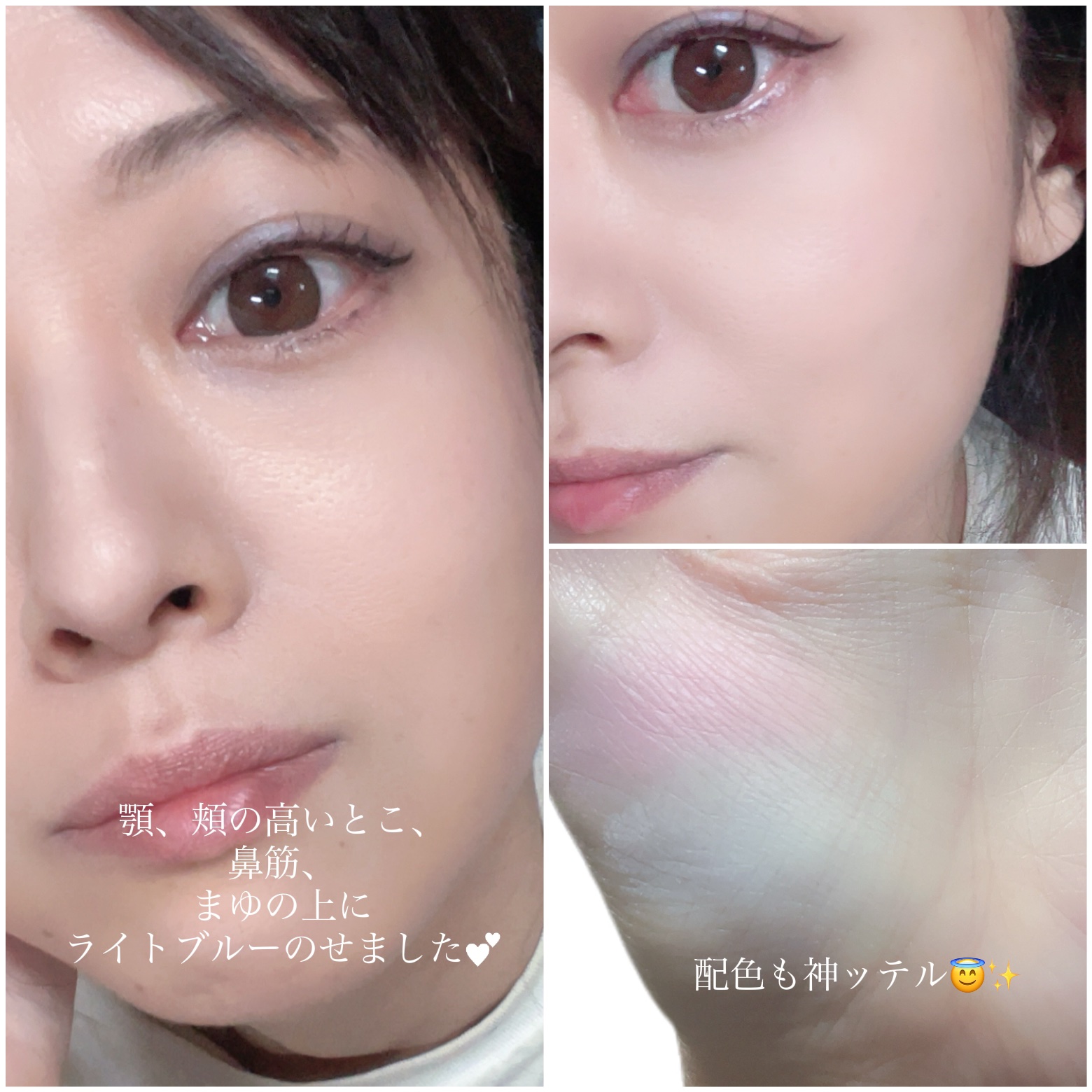 塗りすぎると👻になりますが 上手く使えば黄ぐすみ解消、生まれつきみたいな美白さんに! なんならアイシャドウやチークとのコントラストがでてパキっとするよ(表現力🙏) 目元だけにでも部分的に使うとアイシャドウの発色もよくなります! 元々の色白さんは青すぎると顔色が悪くなってしまいがちなので、白味寄りのブルーを選ぶとよいかもしれません!