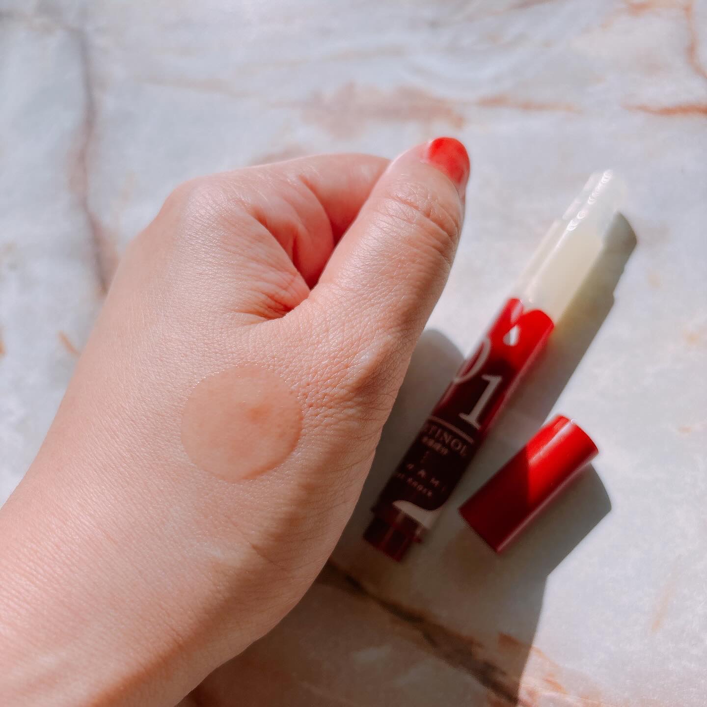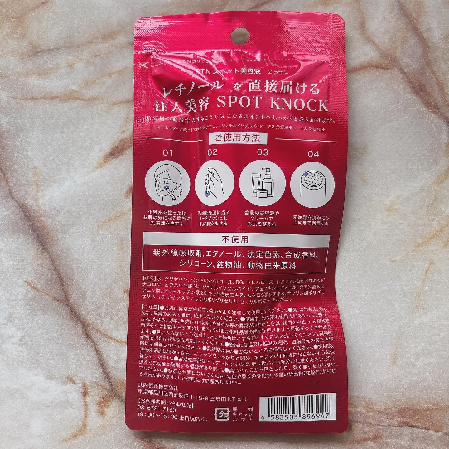 - <2.5mL> 水、グリセリン、ペンチレングリコール、BG、トレハロース、レチノイン酸ヒドロキシピナコロン ヒアルロン酸Na、ジメチルイソソルバイド、フェノキシエタノール、クエン酸Na、クエン酸、グリチルリチン酸2 K、キラヤ樹皮エキス、ムクロジ果皮エキス、ラウリン酸ポリグリセリル-10、ジイソステアリン酸ポリグリセリル-2、カルボマー、アルギニン