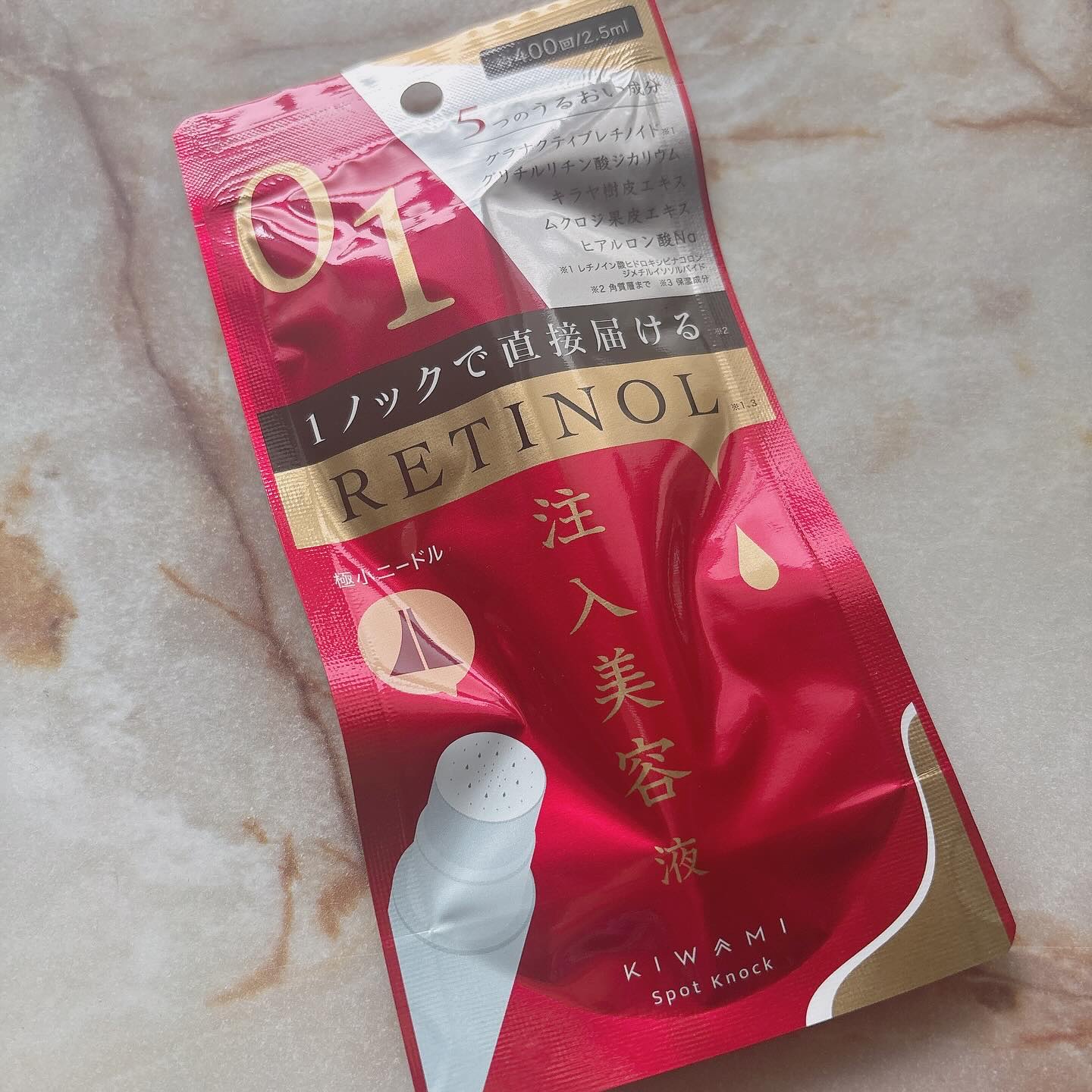 塗るより、貼るより、「直接届ける」新発想 注入型レチノールで肌の中からアプローチ 200μニードルの極小の針を気になる部分にノックして2秒~3秒待つだけ。 美容成分のグラナクティブレチノイド →一般的なレチノールよりも低刺激、なので昼夜使用可!