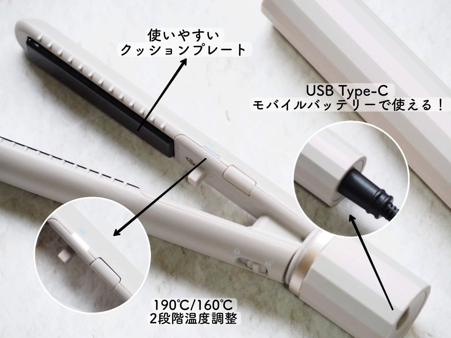 - 大人気のマスカラのようなモバイルヘアアイロンがさらにコスメ感アップしたデザインで、おしゃれになってリニューアル。 外出先で崩れやすい前髪、毛先、おくれ毛もモバイルバッテリーにつなげは、メイクと一緒にさっとお直しがカンタンに。いつでも、どこでも、スタイリング。 メイクポーチや小さいバックにも入る手のひらサイズのコンパクトさと、使用後すぐにしまえるキャップ付きで持ち運びも気軽に。 前髪、毛先、おくれ毛のポイントセットに使いやすいサイドコーム、さらに髪質に合わせて選べる2段階温度機能もついてお直しもカンタン、使いやすい。 付属のmicroUSBケーブルはUSB Type-Cを新たに採用。 洗練されたスタイリッシュなデザインで友達や恋人のギフトにもおすすめのアイテムです。 モバイルヘアアイロンで、キレイなヘアスタイルキープして、1日を楽しもう。 USB Type-Cプラグ採用、もっと使いやすく、ピタっとはさめるクッションプレート、160/190℃の2段階温度調節が可能、約30分で自動で電源が切れる安心機能、使用中抜けずらい専用USBケーブル、髪を巻き込みやすいサイドコーム、誤操作防止自動温度ロック機能、約5分で170℃に到達、髪に効率よく熱を伝えるセラミックコーティング、海外使用、ホワイト・アッシュグレー・ヌードベージュ・パープルブラックで、可愛さも大人っぽさも選べる4色カラーを展開 ※コードレスヘアアイロンではございません。 ※お手持ちのモバイルバッテリーと付属のmicroUSBケーブルにつなげば外出先でいつでもどこでもスタイリング。 ※お手持ちのUSB-ACアダプターにつなげば、家でも使用可能。 ※USB-ACアダプター・モバイルバッテリー・USBシガーソケットは、定格出力DC5.0V、2A以上のものを使用してください。
