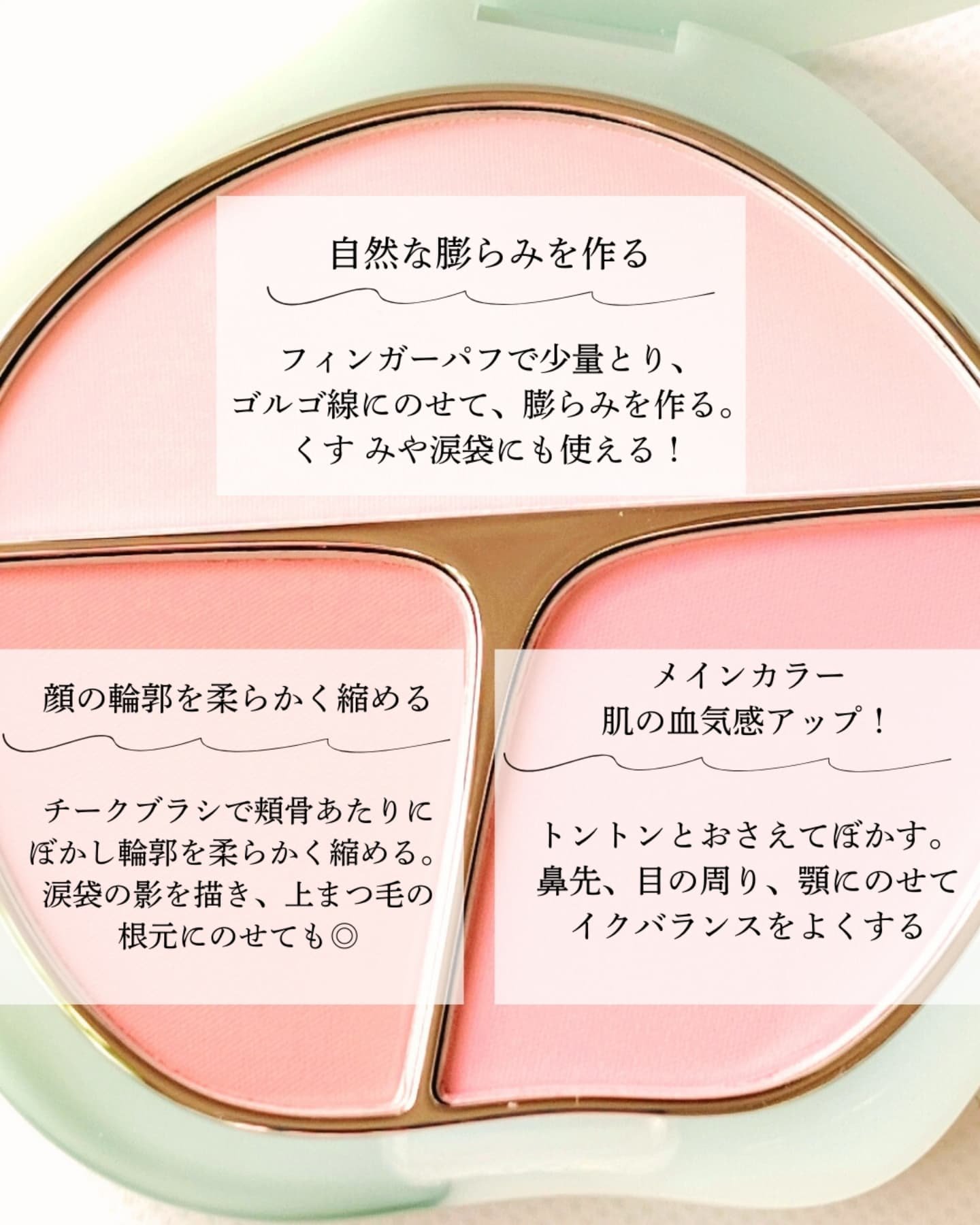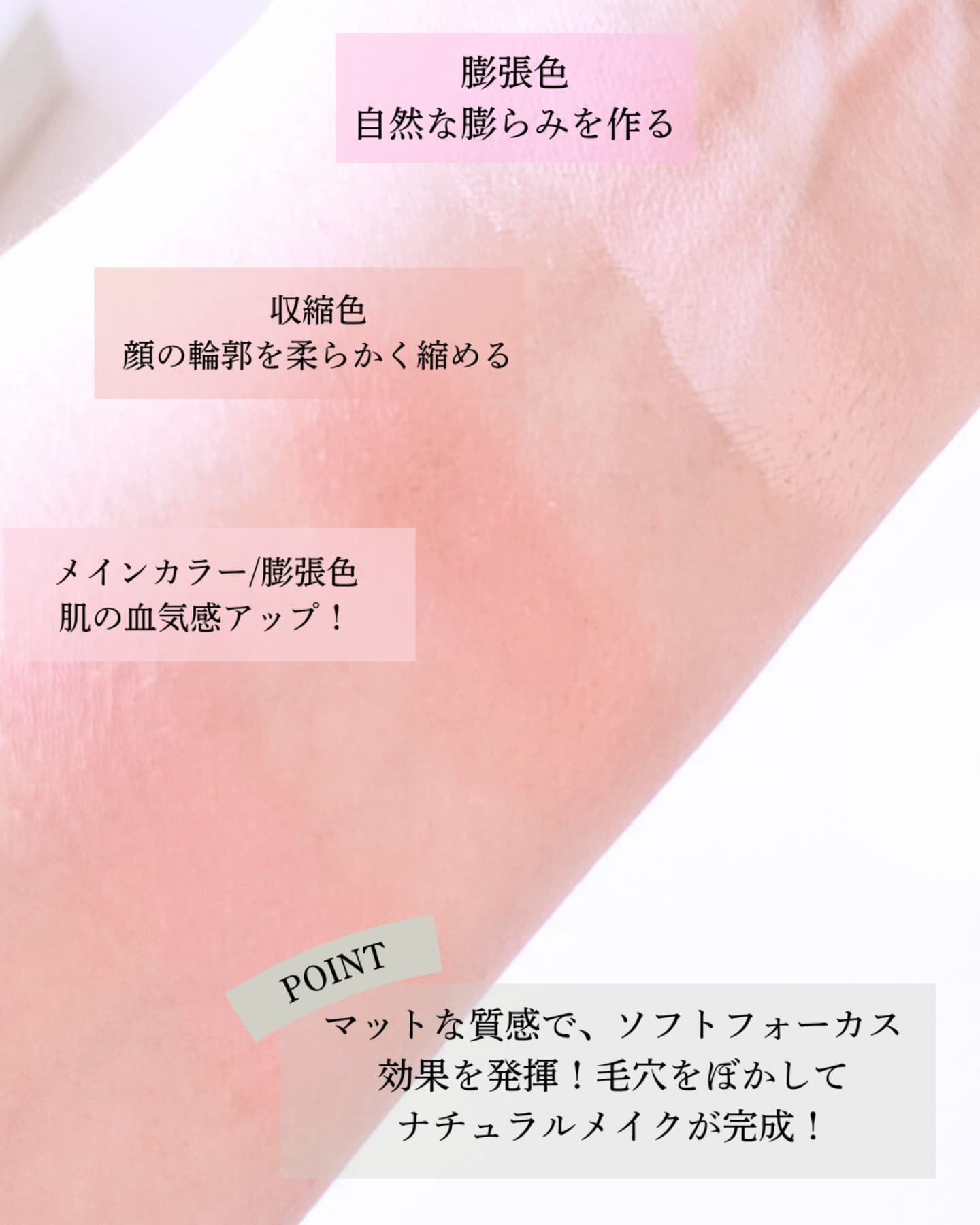 - 「膨張色+メインカラー+収縮色」の三色一体型チークパレット。 異なる明度と彩度の色で自然なグラデーションと立体感を作ることが可能。単色で使用すれば様々な雰囲気のメイクが楽しめ、違う色を重ねて使用すると、三色が程よいバランスで雰囲気と立体感を作り出す。