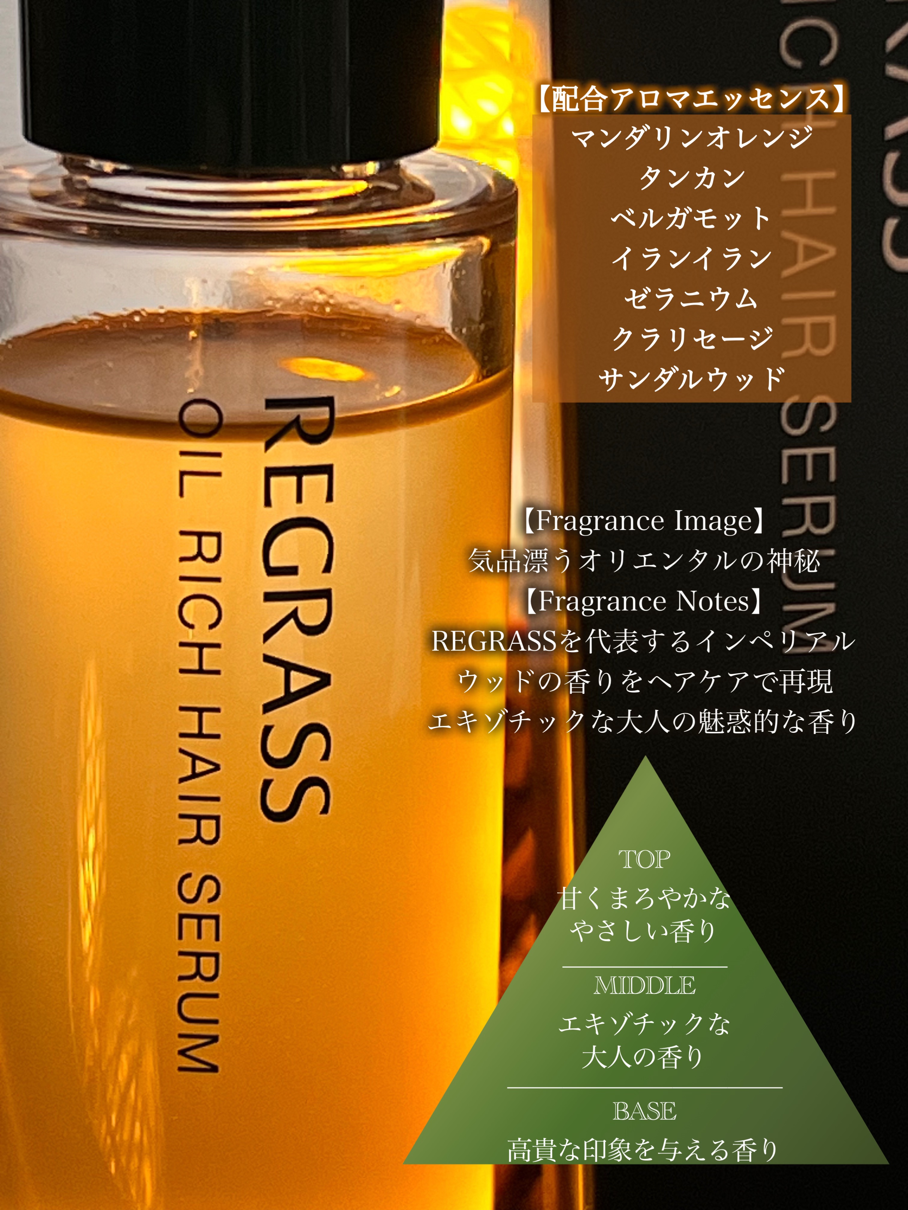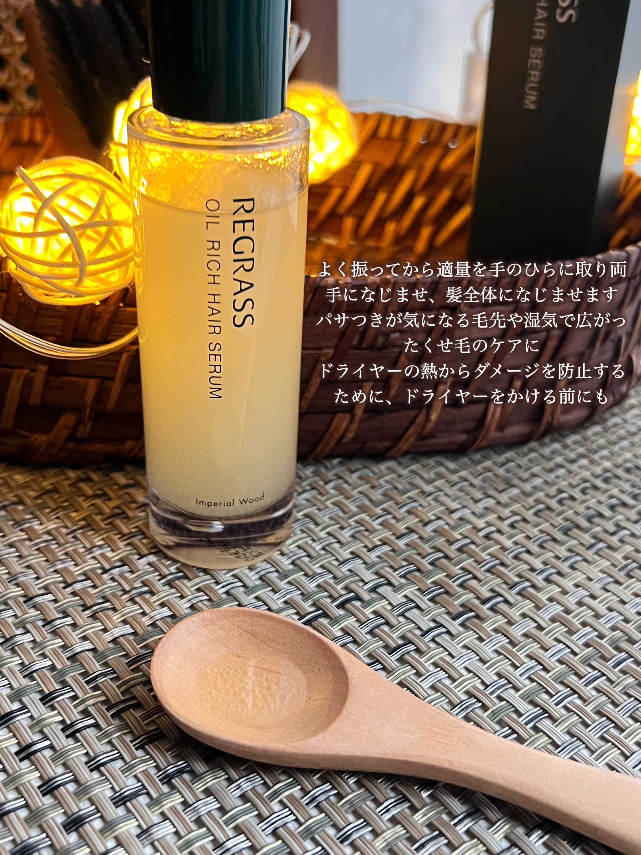 REGRASS“オイルリッチヘアセラム”🌿2層になった髪の毛用セラム🌿インペリアルウッドの香りがとってもいい😌振ってからダメージの気になる毛先からもみ込んでなじませたらしっとりしつつもさらっとまとまる✨私は乾燥と紫外線対策にスタイリング後にサ...