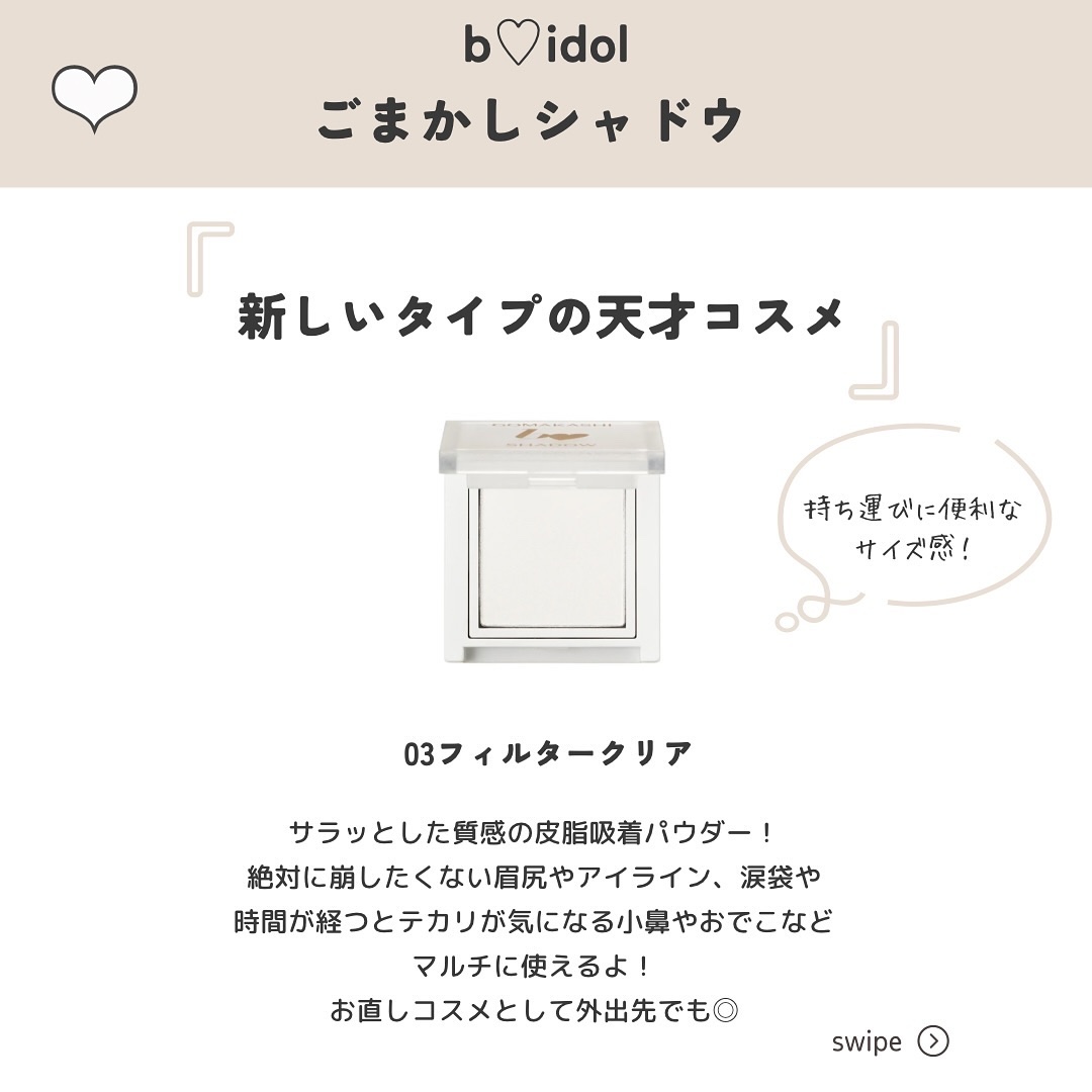 皮脂を抑えてマルチに使える フィルターごまかしシャドウ🎀 これ1つでお直しやニュアンスチェンジのアレンジにも使えるマルチな万能シャドウ! 私が購入した03 フィルタークリアはクリアでさらっと質感の皮脂吸着パウダーなので、皮脂によるテカリが気になるところにささっと塗ると、キレイなベースにお直しすることができます✨ アイラインを引きたい目尻あたりにささっとこれを乗せるとアイシャドウの色味を変えることなくキレイに濃いアイラインを引くことができるのでこの使い方で使うことが多いです👌