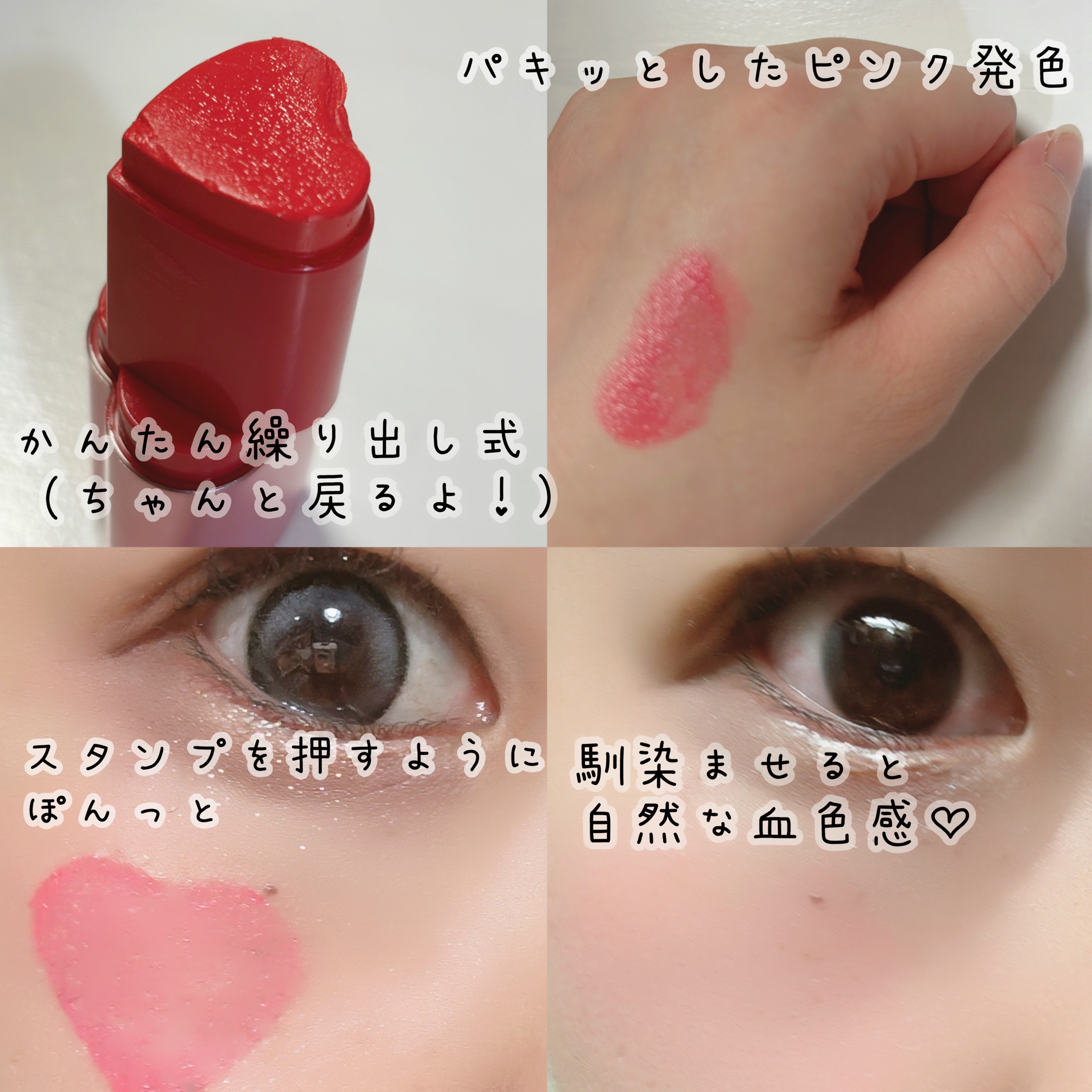 タッチインソルのハートチークが可愛い🩷 最初は濃い発色だけど馴染ませると自然な艶感になってよかった! チークの持続性◎でパンチピンクのカラーが女性らしい可愛いほっぺにしてくれるよ🥰 ✨プリティーフィルターインマイハートスティックチーク