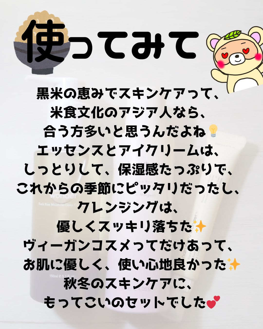 黒米から抽出したぬか成分で肌の栄養補給ができる🌾✨ 天然由来オイルで洗いあがりもつっぱらず、しっとりする感じ🤍 ウォータープルーフのメイクもちゃんと落ちるよ‼️ 100%植物由来の植物性レチノールのバクチオール配合!! 黒米の発酵エキスが肌の弾力ケアしてくれるから目元からふっくら🩷