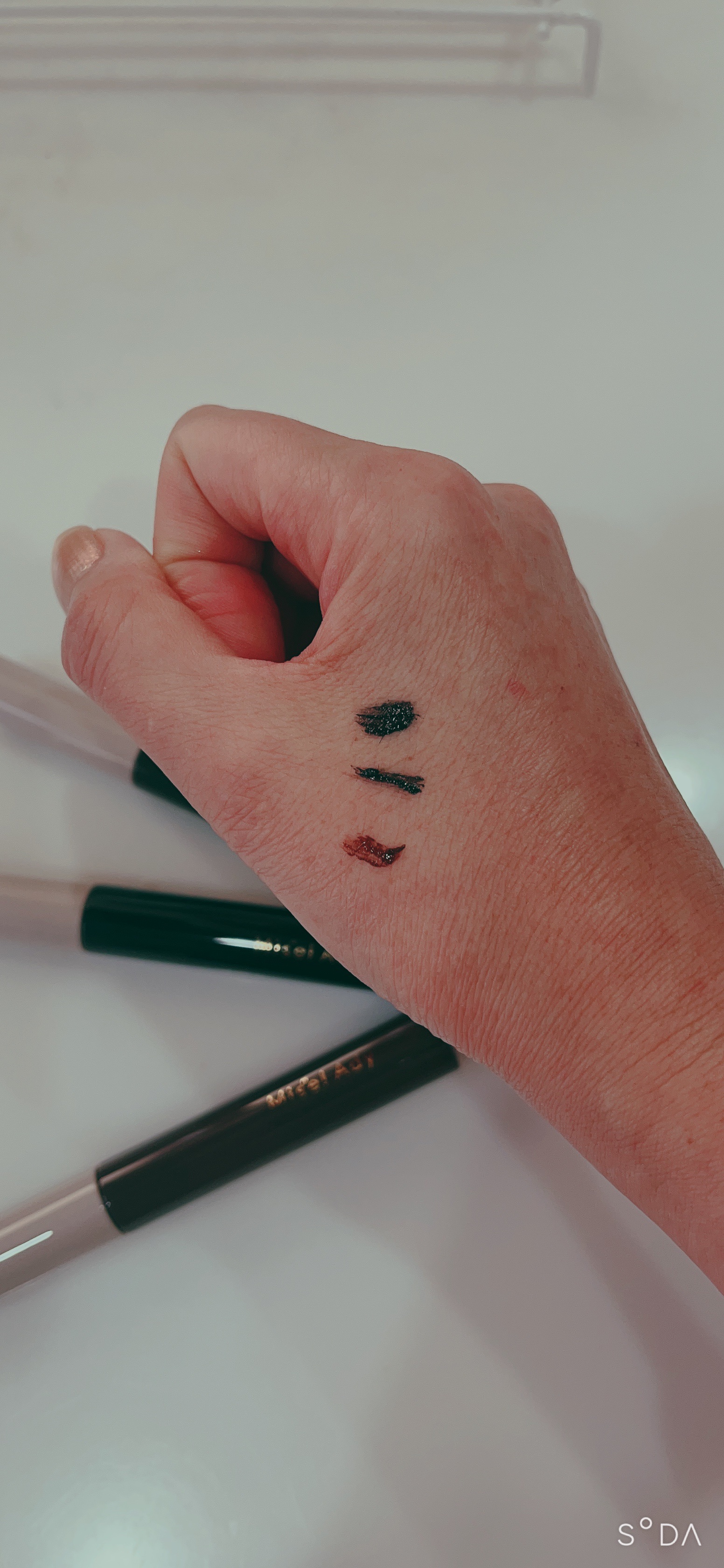 ひと塗りで透け感があり、重ねて描いていくと自分好みにかえていけるのでその日の気分やTPOに合わせて使い分けできるのがいいです。 極細筆なのでラインもキレイに描きやすく、一日中にじまないしっかりとした使いやすいアイライナーです。