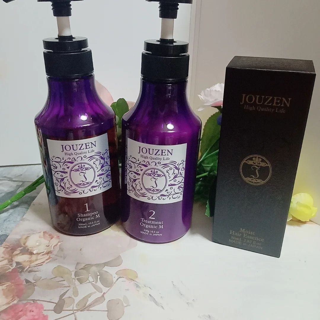 ハイダメージ、乾燥毛のためのスペシャルケアセット✨ 上善のシャンプーの中で最も高保湿な仕上がりの<モイストMシャンプー>&<トリートメント>、そして<モイストエッセンス>で冬の気になるパサつき広がりやすい髪にしっとり潤いを与えてくれる、とてもハイクオリティなセットをご紹介させていただきます💖 低分子ケラチン配合で徹底ダメージケア、そして抗酸化成分フラーレン配合でエイジングケアを叶えてくれて、13種類もの美容液成分がうるおいケアまで叶えてくれるというもの。 高級感のある紫色のパッケージが印象的。まるで高級ホテルのアメニティのよう。香りは上品で大人っぽい香りを感じます。