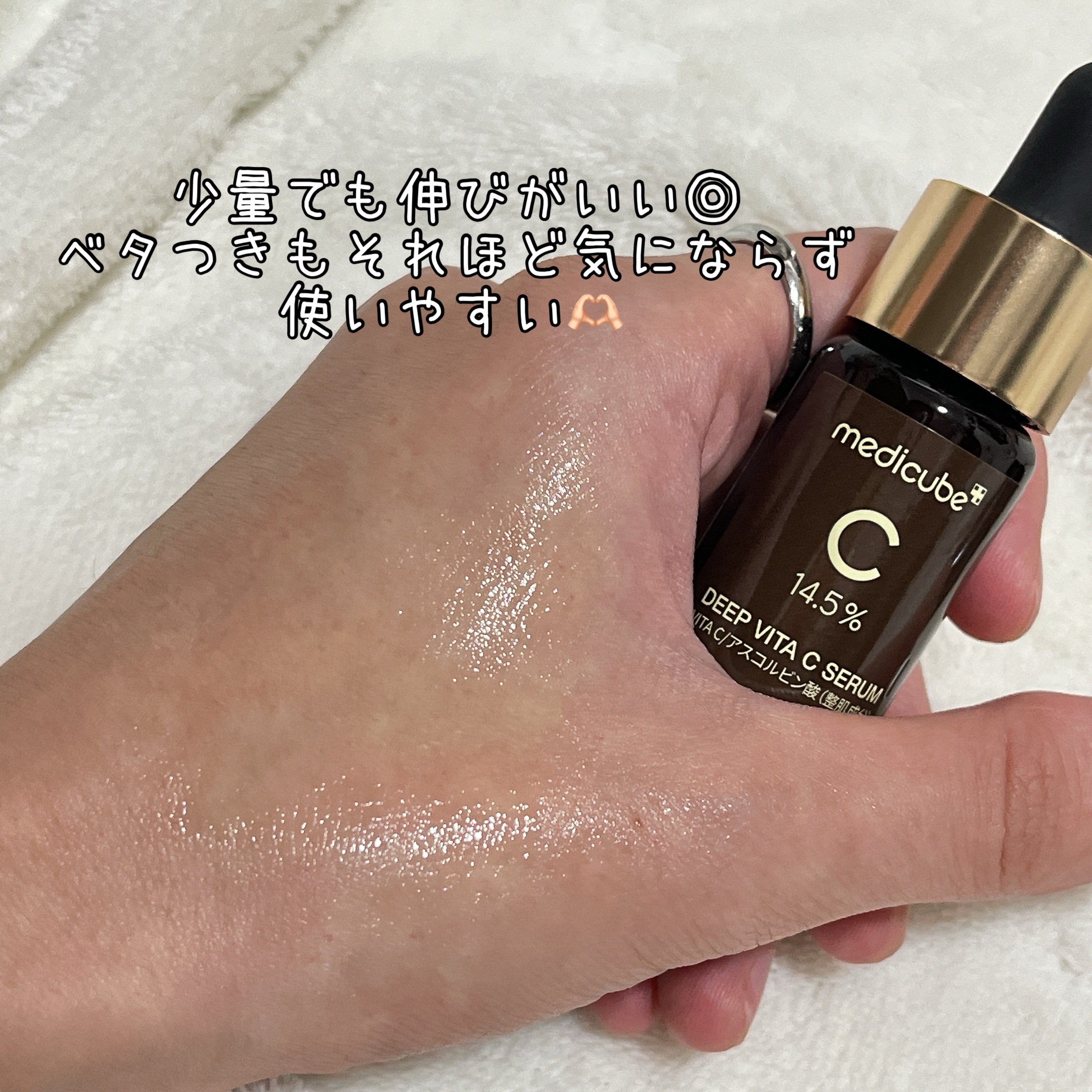 - 高濃縮のピュアビタミンC*やグルタチオン*をたっぷり配合した美容液です。 べたつかないテクスチャーで肌を保湿し、ツヤのある美肌に導きます。 ☑ピュアビタミンC* 145,000ppm配合 ☑独自整肌成分MELA-FADE ☑ナチュラルビタコンプレックス:カムカムの実エキス*・ビタミンツリーウォーター*・カカドゥプラムエキス*配合 ☑ビタミンの鮮度を維持するため、茶色の瓶3本に小分けしたパッケージを採用 ☑肌の角質層により浸透されやすい、こだわりのpH濃度(pH4.0以下)に設定 ☑乾燥によるくすみケア/弾力ケア/保湿ケア/肌キメケア 化粧水などでお肌を整えたあと、適量を取り、お肌のキメに沿ってまんべんなく塗った後、やさしくなじませます。 * 保湿成分 ■お肌に異常が生じていないかよく注意してご使用ください。化粧品がお肌に合わないとき即ち次のような場合には、使用を中止してください。そのまま使 用を続けますと、症状を悪化させることがありますので、皮膚科専門医等にご相談されることをおすすめします。また、傷やはれもの、しっしん等の異常が ある部位には、ご使用にならないでください。 (1)使用中、赤み、はれ、かゆみ、刺激、色抜け(白斑等)や黒ずみ等の異常があらわれた場合 (2)使用したお肌に、直射日光があたって上記のような異常があらわれた場合 ■目に入らないようご注意ください。目に入ったときは、こすらずにすぐに洗い流してください。その後、目に異常が残る場合は、眼科専門医へご相談され ることをおすすめします。 ■極端に高温又は低温の場所、低湿、高湿の場所、直射日光のあたる場所には保管しないでください。 ■衣類につくと、しみになることがございますのでご注意ください。 ■乳児、子供の手の届かない所に保管してください。