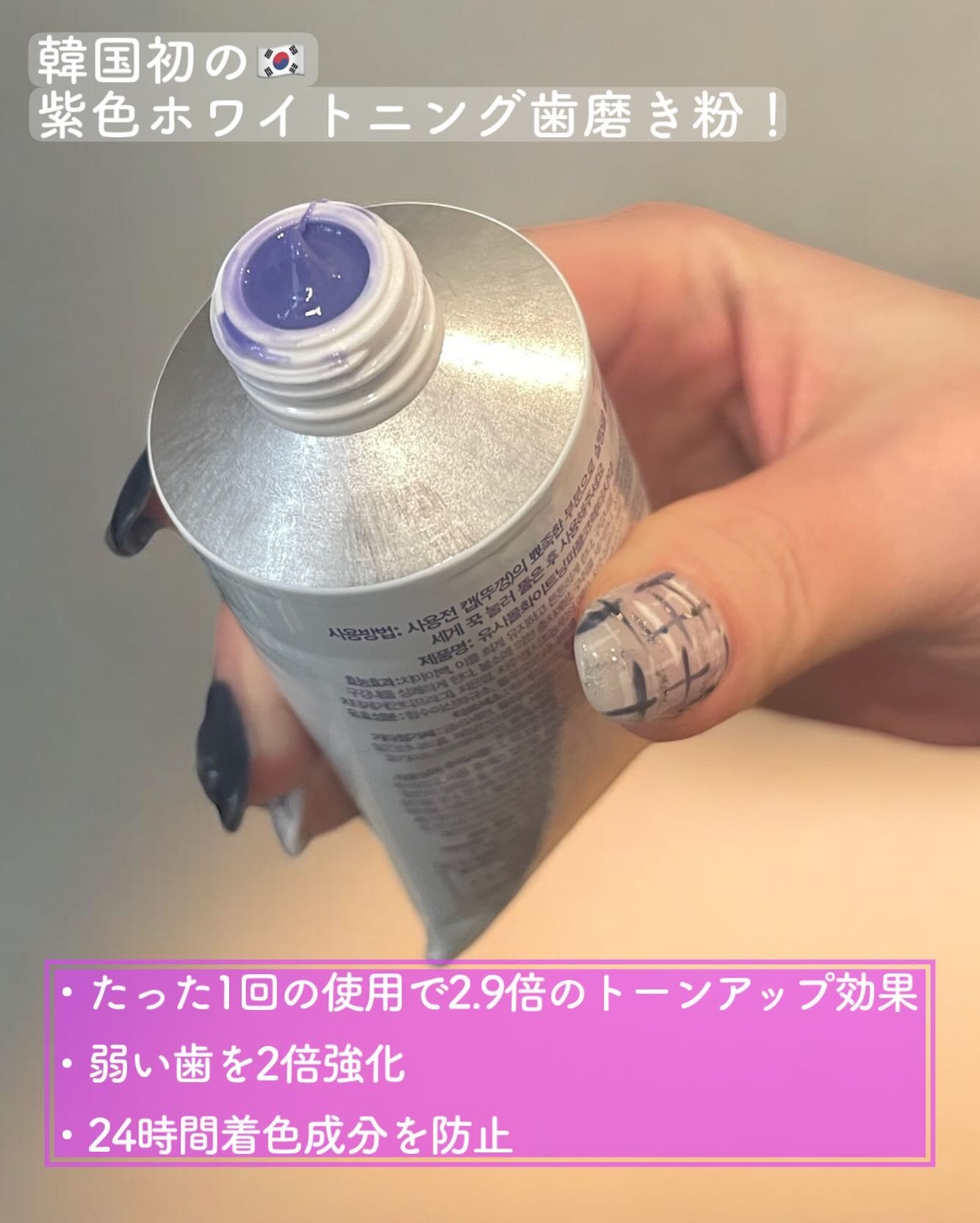 韓国初の紫色のホワイトニング歯磨き粉🪥 紫色のホワイトニング歯磨き粉で黄色の歯を白くトーンアップ🦷✨ 24時間続く着色防止バリアで着色成分を抑制も◎ 爽快感があって歯がツルっとするからお気に入り🫶🏻