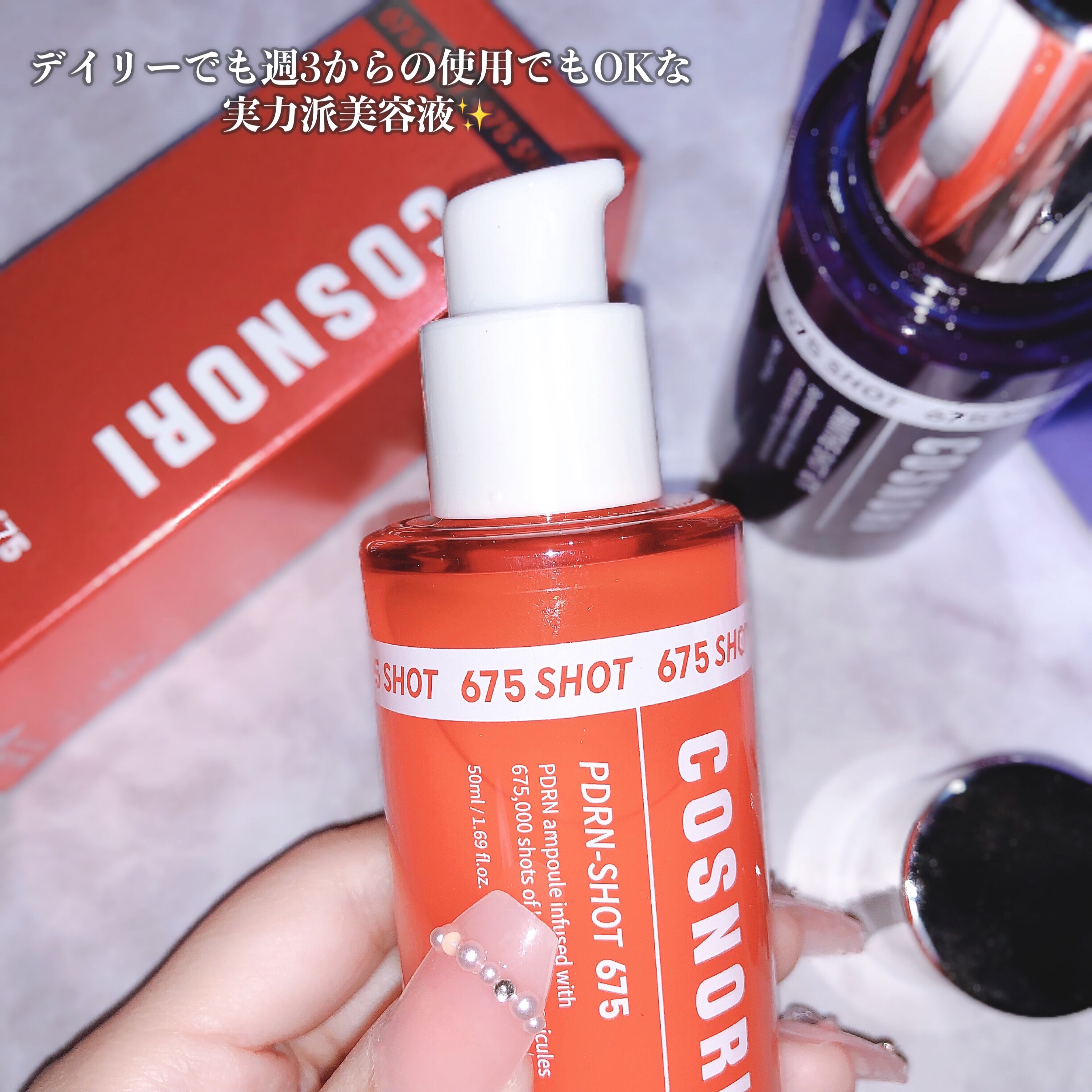 肌の組織と最も類似している成分サーモンPDRN 5,000ppm配合しており弾力ケアができるだけでなく、保湿&肌バリア保護に優れたパンテノール成分50,000ppmが配合。 保湿&肌バリア保護に優れたパンテノール100,000ppm配合。さらにナイアシンアミド・アデノシン配合で美白&弾力ケアまで同時に。 PDRNショット675はとろみがあるもののなじみが良くモチッとうるおい感のある肌に。