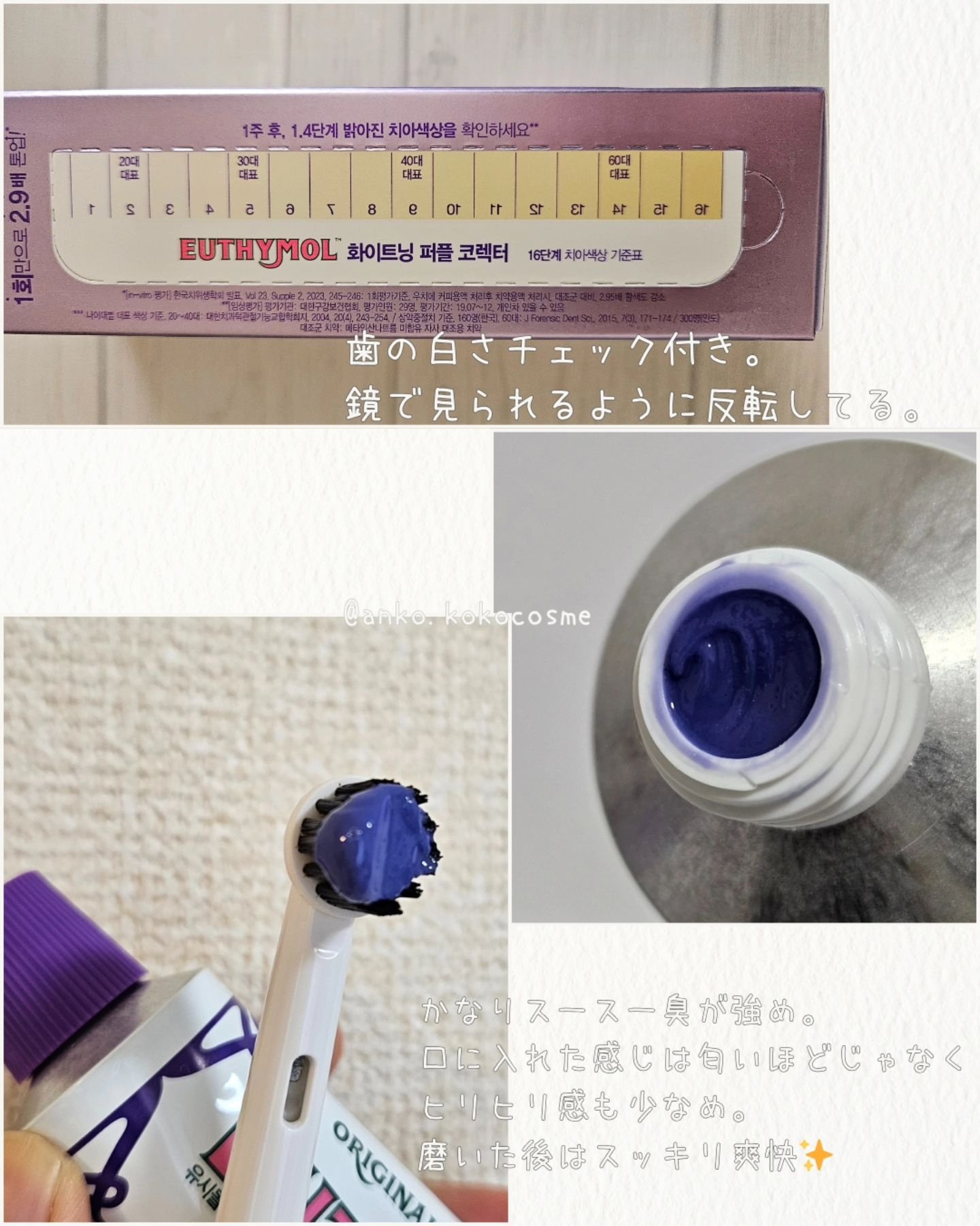 ユーシモールのパープルコレクターは実は提供いただく前から愛用中💜 コーヒーもカレーも大好きで、黄ばみの敵ばかり摂取しちゃうし歯医者では歯磨き下手くそって言われるし歯の黄ばみは永遠の悩み(;o;)エーン ホワイトニング成分たっぷり🦷🤍 保護成分が1日中着色を予防してくれるのでマッジでツルツルの歯が維持できる🫱🏽🫲🏼 見た目は紫!紫ペースト! 黄色の補色の紫で期待の塊ビジュアル💜 味は湿布!スースーする🧊