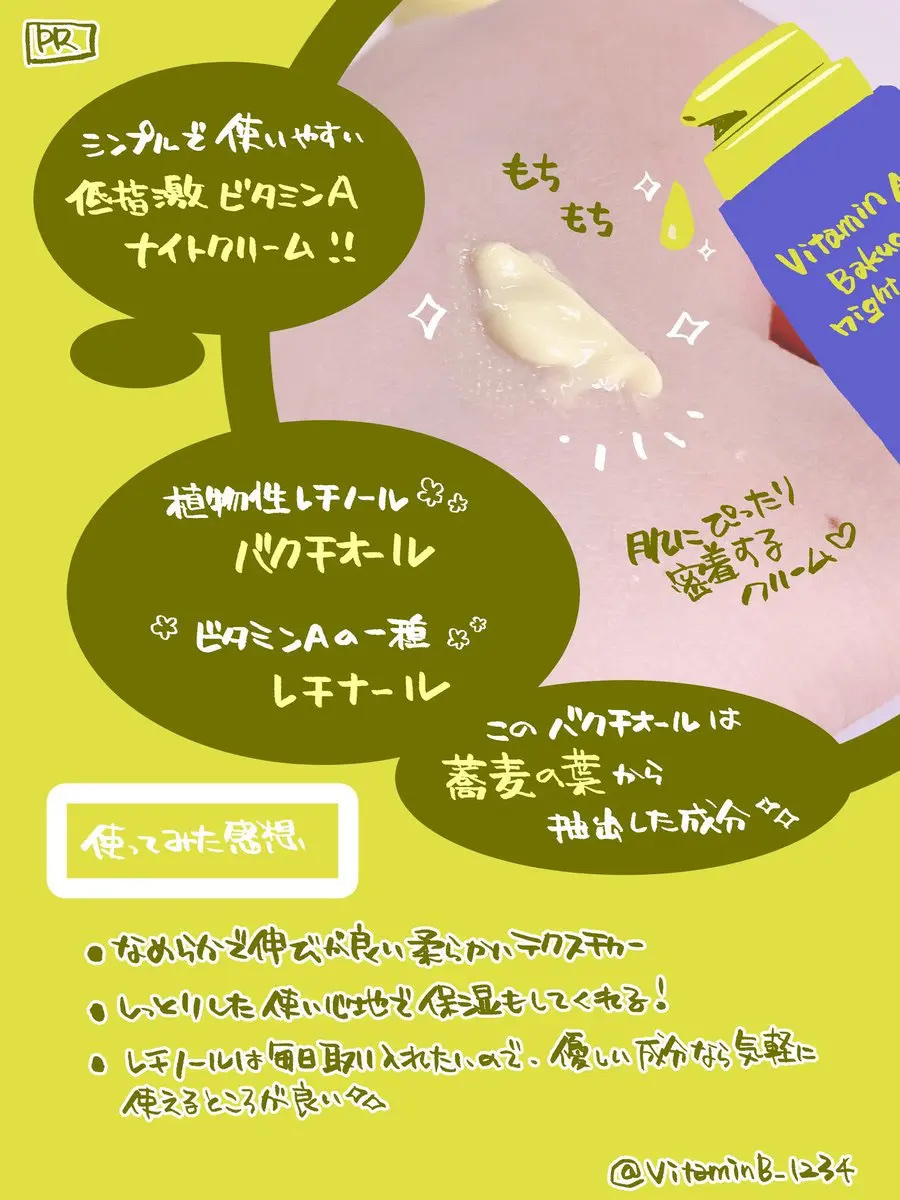 初心者さんでも使える低刺激ビタミンAナイトクリーム🌙*゚ 1回の使用でしっかりと変化❣️ 毛穴、シワ、肌質改善効果あり😳 もちっとした肌にぴったり密着するクリーム💫 トリートメントした後のような肌になれる濃密なテクスチャー💛 保湿力が持続し1日中なめらかな肌へ🫧 夜のスキンケアの1番最後に使用❣️