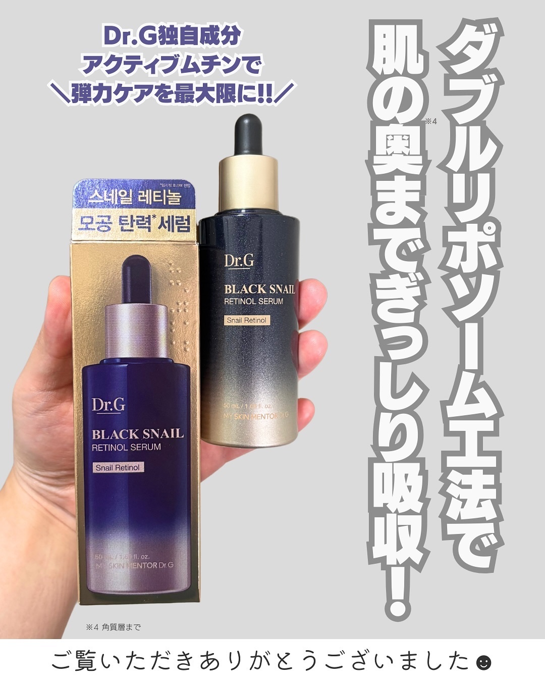Dr.G(ドクタージー)ブラックスネイルレチノールセラムエイジングケア*に良いとされる成分、レチノール。魅力的だけどお肌への刺激が気になります。Dr.Gのレチノールは、刺激は少ないけど効果の高い第3世代レチノールなんだそう。さらにブ...