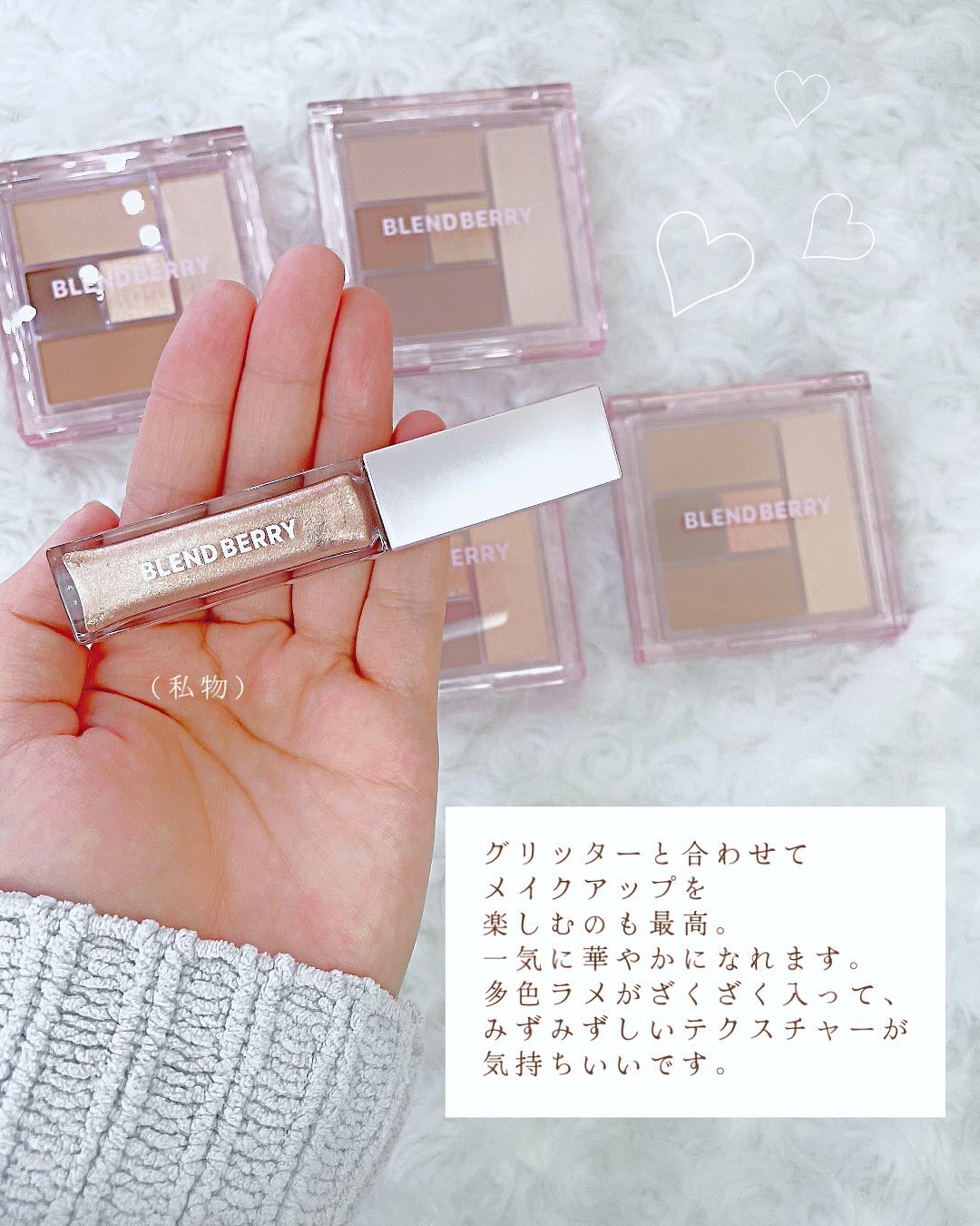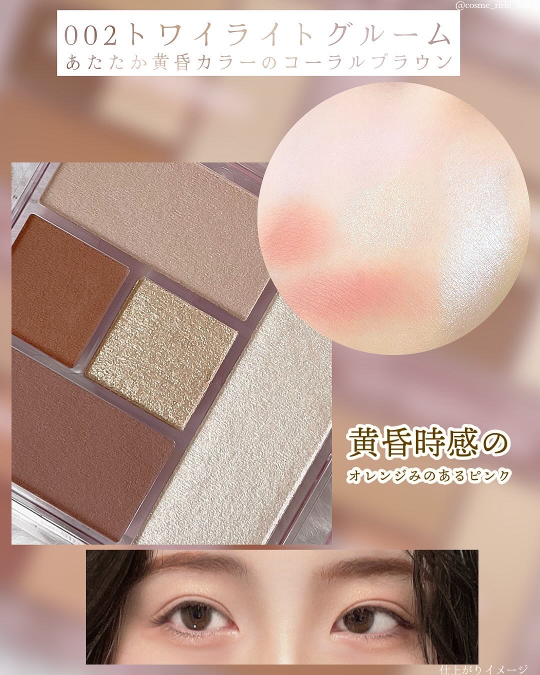 右側はぷにっとした柔らかな質感で、繊細な偏光ラメがちらちらと輝きます。 左側はふわさらな粉質のマットで、グラデーションをつけるとふんわり甘い印象に。 肌なじみが良くて使いやすいのがうれしい🩷