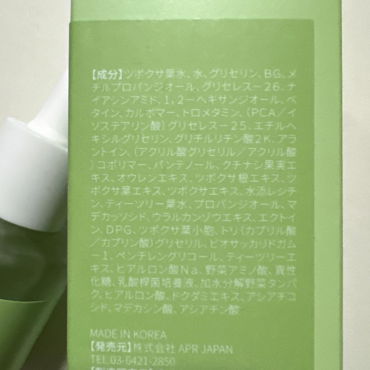 - <30ml> ツボクサ葉水、水、グリセリン、BG、メチルプロパンジオール、グリセレス-26、ナイアシンアミド、1,2-ヘキサンジオール、ベタイン、カルボマー、トロメタミン、(PCA/イソステアリン酸)グリセレス-25、エチルヘキシルグリセリン、グリチルリチン酸2K、アラントイン、(アクリル酸グリセリル/アクリル酸) コポリマー、パンテノール、クチナシ果実エキス、オウレンエキス、ツボクサ根エキス、ツボクサ葉エキス、ツボクサエキス、水添レシチン、ティーツリー葉水、プロパンジオール、マデカッソシド、ウラルカンゾウエキス、エクトイン、DP G、ツボクサ葉小胞、トリ(カプリル酸/カプリン酸)グリセリル、ビオサッカリドガム-1、ペンチレングリコール、ティーツリーエキス、ヒアルロン酸NA、野菜アミノ酸、異性化糖、乳酸桿菌培養液、加水分解野菜タンパク、ヒアルロン酸、ドクダミエキス、アシアチコシド、マデカシン酸、アシアチン酸