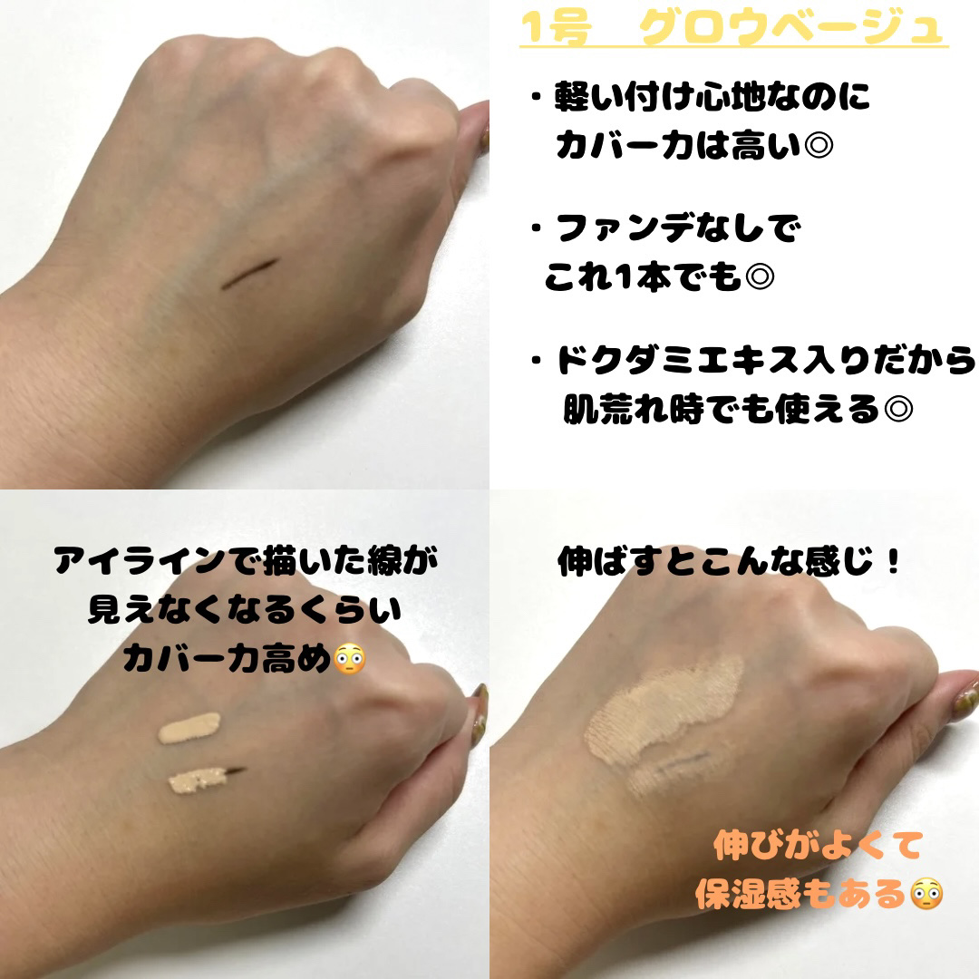 - <1号 グロウベージュ> ドクダミエキス、1,2-ヘキサンジオール、フェニルトリメチコン、酸化チタン、水酸化Al、トリエトキシカプリリルシラン、ステアリン酸、BG、シクロペンタシロキサン、シクロヘキサシロキサン、ジステアルジモニウムヘクトライト、炭酸プロピレン、PEG-10ジメチコン、タルク、水、PVP、酸化鉄、セチルPEG/PPG-10/1ジメチコン(ビニルジメチコン/メチコンシルセスキオキサン) クロスポリマー、スベリヒユエキス、DPG、プロパンジオール、ヒアルロン酸、加水分解ヒアルロン酸、ヒアルロン酸Na、塩化Na、トリメチルシロキシケイ酸、安息香酸Na、ソルビン酸K、酸化亜鉛、ハイドロゲンジメチコン、トリ(カプリル酸/カプリン酸)グリセリル、ステアラルコニウムヘクトライト、ジイソステアリン酸ポリグリセリル-3、ポリリシノレイン酸ポリグリセリル-3、パンテノール、ポリヒドロキシステアリン酸、パルミチン酸エチルヘキシル、ミリスチン酸イソプロピル、イソステアリン酸、レシチン、酢酸トコフェロール、ツボクサエキス、ラベンダーエキス、メボウキ葉エキス、ライラックエキス、アルテア根エキス、アシタバエキス、ローズマリーエキス、マルトデキストリン、糖水解物、EDTA-2Na <2号 ナチュラルベージュ> ドクダミエキス、1, 2-ヘキサンジオール、フェニルトリメチコン、酸化チタン、水酸化Al、トリメチルシロキシケイ酸、水、安息香酸Na、ソルビン酸K、酸化亜鉛、ハイドロゲンジメチコン、トリ(カプリル酸/カプリン酸) グリセリル、ステアラルコニウムヘクトライト、ジイソステアリン酸ポリグリセリル-3、ポリリシノレイン酸ポリグリセリル-3、パンテノール、酸化鉄、トリエトキシカプリリルシラン、ポリヒドロキシステアリン酸、パルミチン酸エチルヘキシル、ミリスチン酸イソプロピル、イソステアリン酸、レシチン、酢酸トコフェロール、ツボクサエキス、BG、ラベンダーエキス、メボウキ葉エキス、ライラックエキス、アルテア根エキス、アシタバエキス、ローズマリーエキス、マルトデキストリン、糖水解物、EDTA-2Na