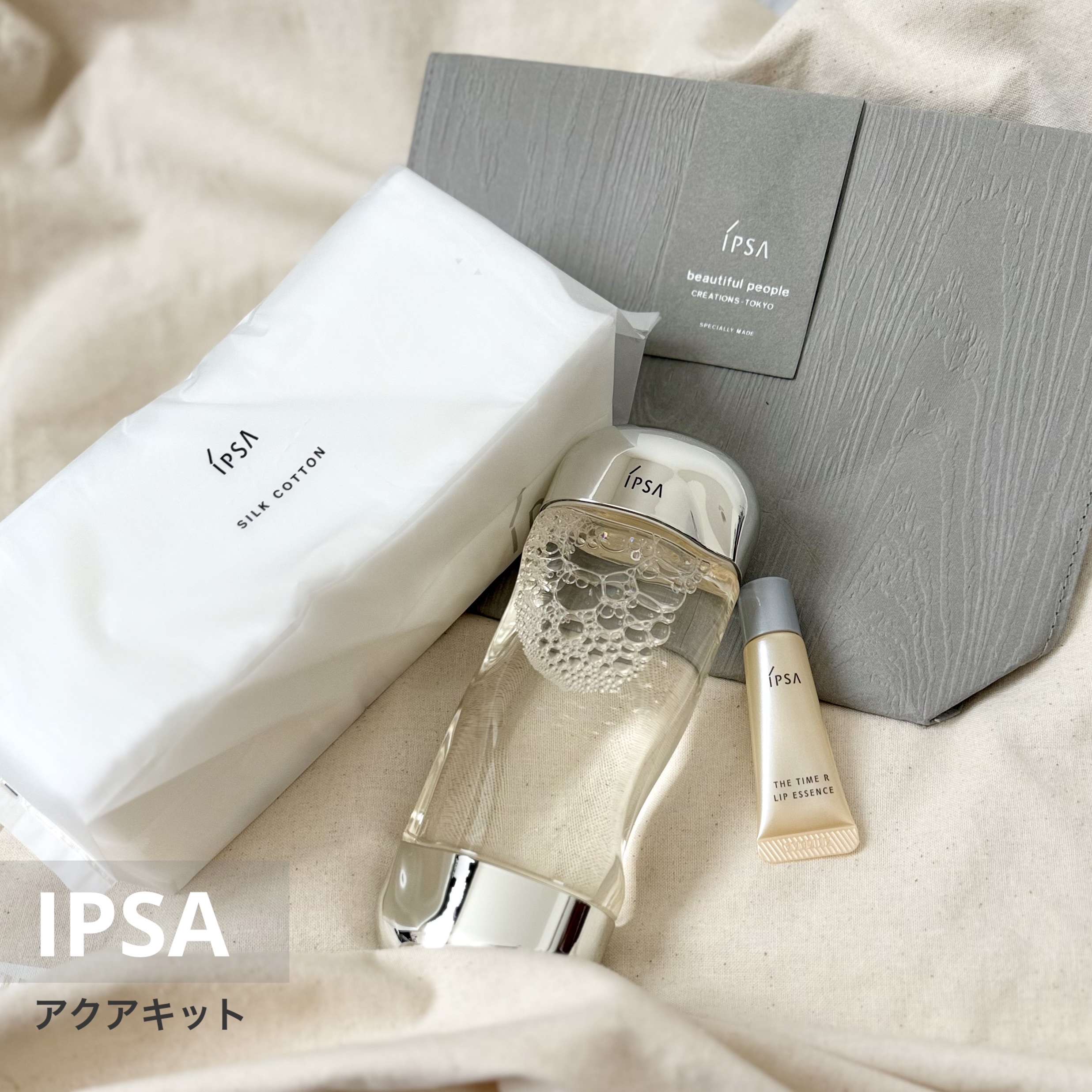 - 数量限定発売 <セット内容> 1.イプサ ザ・タイムR アクア (医薬部外品)(現品) 【200mL】 肌表面に水の層をつくり、うるおいを留め角層にじっくり浸透。 肌をたっぷりのうるおいで満たし、キメを整える薬用化粧水。 2.イプサ ザ・タイムR リップエッセンス(特製サイズ)【4.5g】 唇をみずみずしく保ち、紫外線も防止する唇用美容液。 SPF18、PA++ 3. イプサ シルクコットン【50枚入】 高級天然シルク配合。上質でなめらかな使い心地。 4.コスメバッグ 3種から1品選択 環境に配慮したジャクロン素材を採用。 beautiful people特別エディション。 *一部店舗のみ、4種から1品選択 店頭・公式オンラインショップ:10月15日(火)より予約受付開始 ・コスメバッグ W 222mm×D 60mm×H 150mm ※公式オンラインショップ、IPSA AOYAMA、伊勢丹新宿店、渋谷PARCO店、ジェイアール名古屋タカシマヤ、阪急うめだ本店は全店舗展開カラー3色に加え、店舗限定カラー1色を含む4種から1品選択可能。