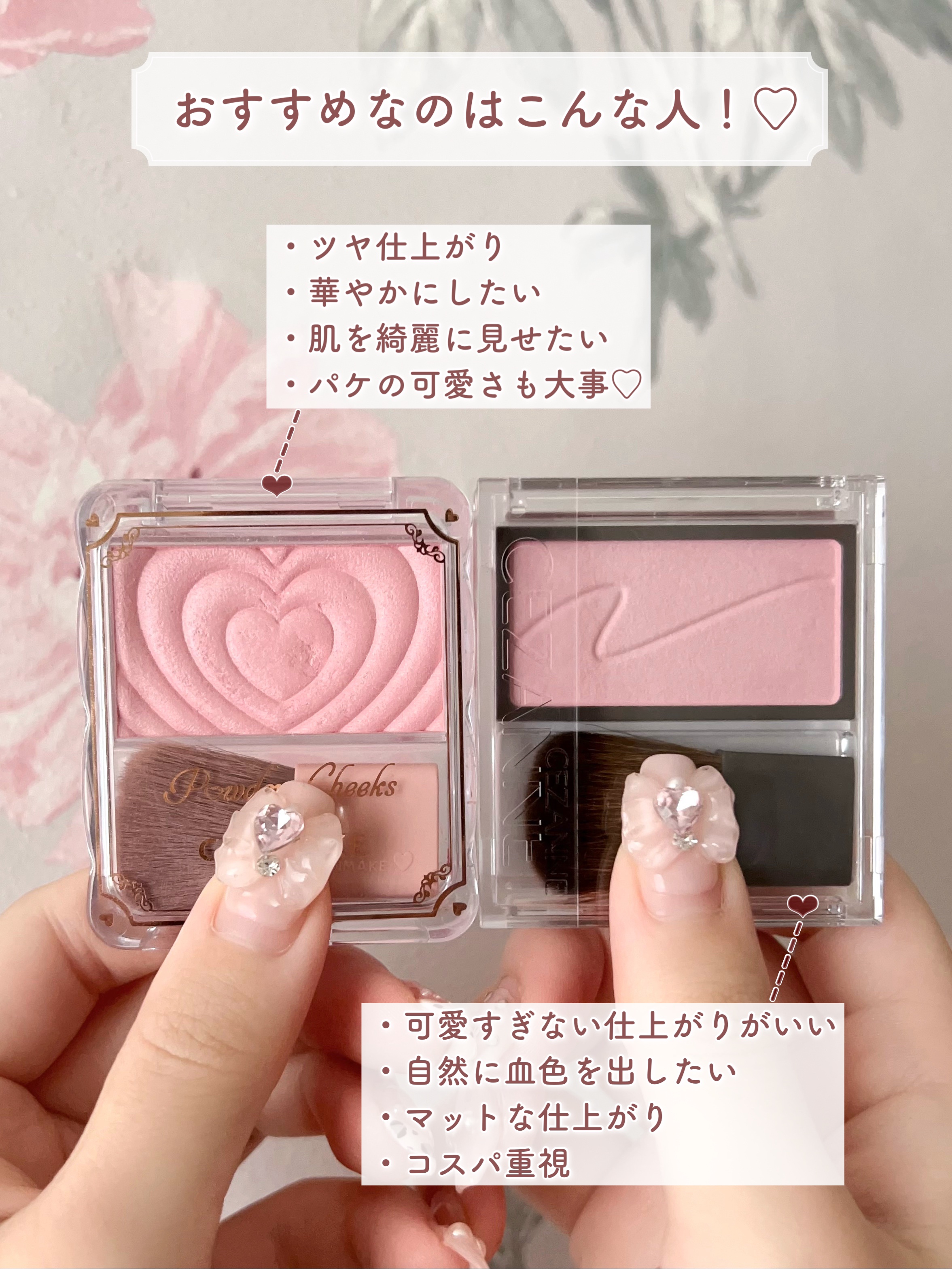 どっちも似たような色味なんだけど、絶妙に違いがあって可愛い🥰 CANMAKEもCEZANNEもしっとり粉質で密着するしプチプラでこれはすごい。 個人的に可愛くしたいならCANMAKE、甘すぎず大人っぽくしたいならCEZANNEかな💭