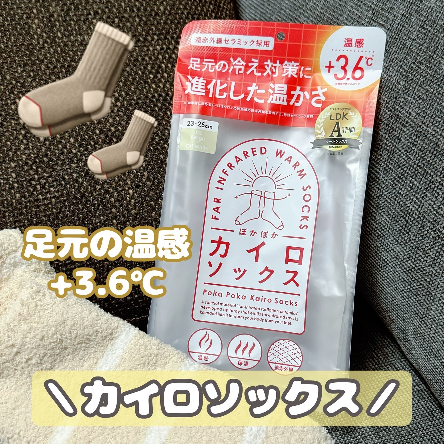 辛口コスメ評価誌”LDK”でA評価🎉 遠赤外線放射セラミックを練り込んだ繊維を使用し 履くだけで足元の温感+3.6°C🤭 冬の足元の冷えや、冷え性にふくらはぎまでカバーする長さで膝下までぽかぽかに😮💨💗 これなら履き心地もよいし、すぐに温かくなる〜!脚って冷えると脂肪ついちゃうからふくらはぎまであるの安心🤍