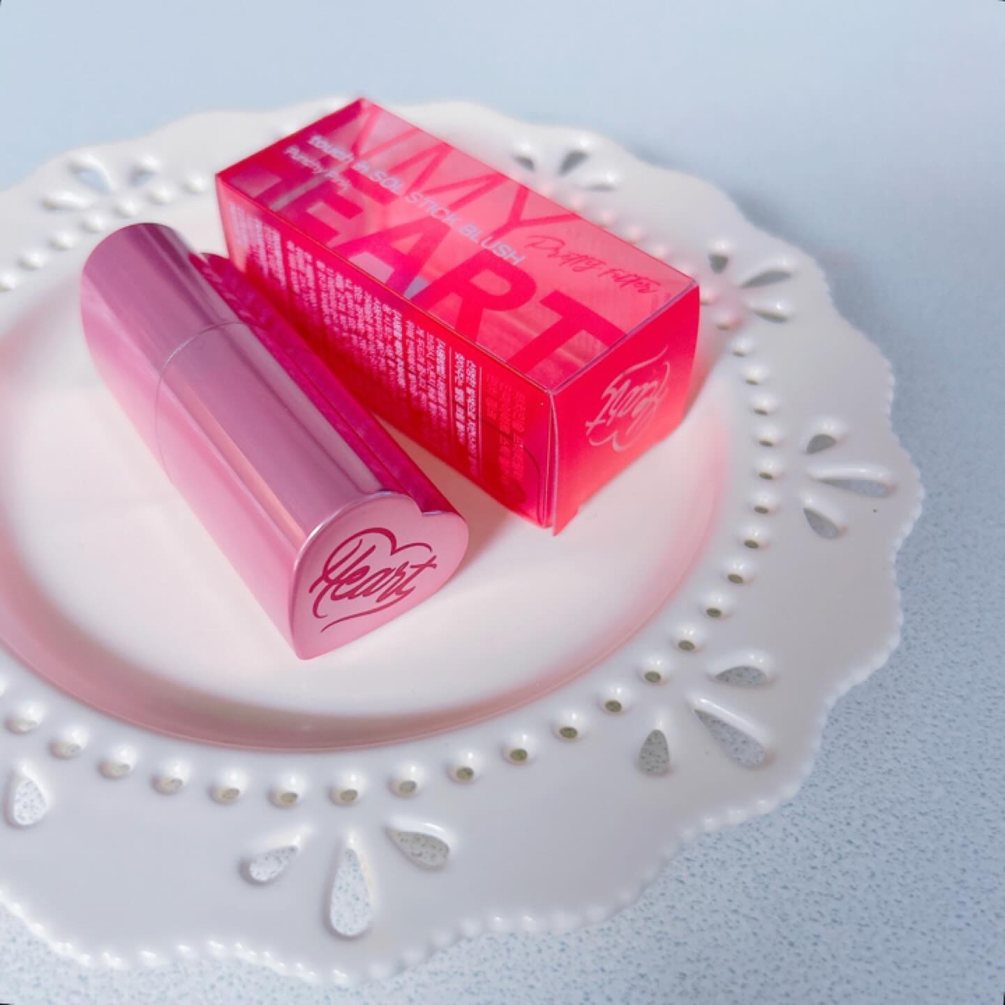 パケから可愛すぎるハートチークです! ♡チークカラーの発色力、持続力◎ 24時間カラーが持続すると紹介がありました! ♡チークのツヤ感とシーズンに合う色✨ クリーミーなテクスチャーかつツヤ感が綺麗! パンチピンクのカラーは彩度の高い水彩画ピンクです! 特にブルベ夏の方にオススメしたいカラーです🩷