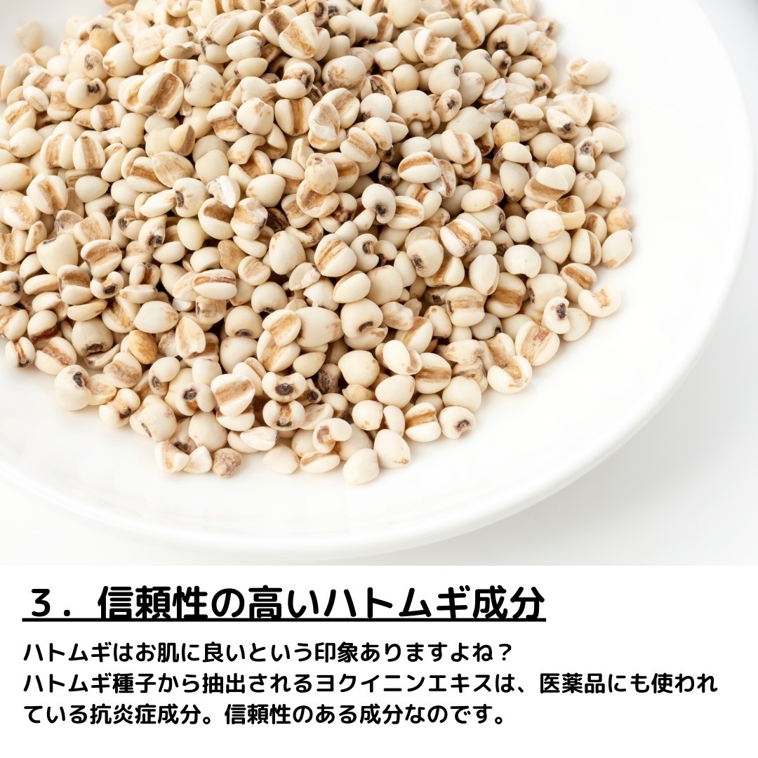 私がおススメする成分、それがハトムギエキス種子エキス。医薬品成分のヨクイニンエキスは、簡単に言うとハトムギ種子エキスを更に厳選したもの。 これ1本!"化粧水+乳液+美容液"。素肌のコンディションをたもつ、Wハトムギ保湿成分。
