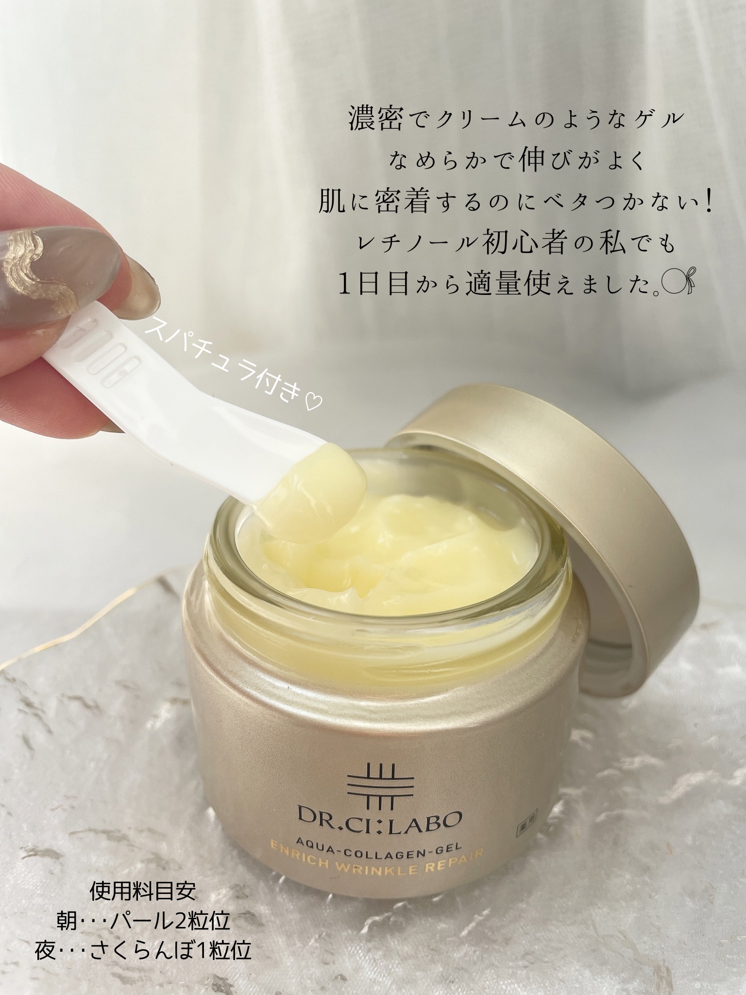 美容皮膚科学発想の真皮にアプローチするシワ改善ゲル ❤︎純粋レチノール*配合と有効成分ナイアシンアミドの2大成分配合 ゲルがお肌に密着してなじんで、その後にムチっ!ぷりっ!てするんですw思わず毎日使いたくなる使用感✨ 先回りのシワ改善ケアが出来ちゃうってところもステキ過ぎる〜🫶