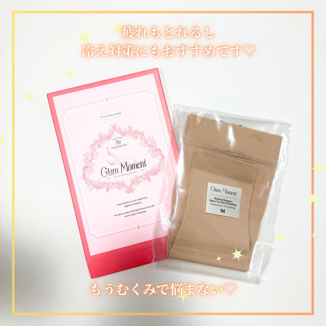 このフィット感たまらない❣️ グラムモーメント メディカルサポートオープントゥショート 医療用圧迫ストッキング 締め付け感が気持ちいい~♪ 背筋が伸びて(ふくらはぎが着圧されるとシャッキっとなる)身体が守られてる気も〜♪ しっかりした素材なので破ける心配も少ないから助かります。洗い替えにもう一枚欲しい〜♪