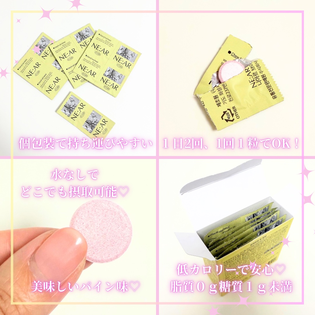 水なしで、いつでもどこでも摂取できるNE:AR V-CARE✨ 6種類の美容成分と7種類の混合乳酸菌&むくみ取りに効果的な原料といわれるスーパーフルーツのフランス産オーガニックサボテンの果実縮粉末配合でバランスよくデトックス! 個包装だから持ち運びにも便利だしなにより味がパイナップル味で美味しいの🤤🍍 おやつ感覚で食べれるから続けやすいのは嬉しいよね☺️ 毎日ポーチに入れて持ち歩いてるよ♪