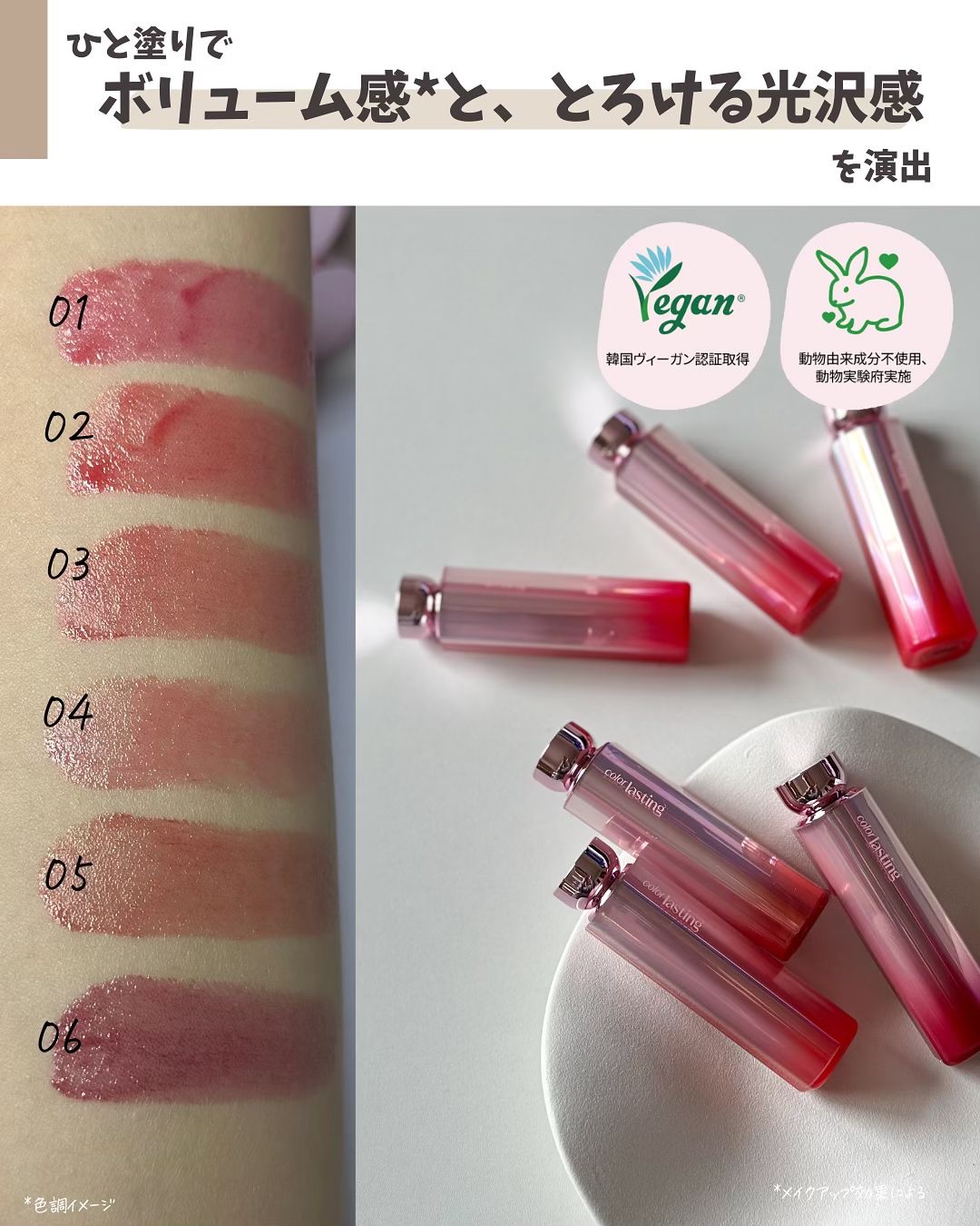 - ・じゅわっと透明感*¹ ある美発色 ティントでありながらも自然なリップカラーを演出。 見たまま美発色で唇を彩り、グロウなテクスチャーでありながらカラーフィクシングが可能。 ・ひと塗りでボリューム感*¹ と、とろける光沢感を演出 独自成分*² により反射光を効果的に演出し、唇の皺を見えにくくする。 また、モイスチャー感と光沢感もキープし、生ツヤっぽい光沢感を演出。 ・クリアなレイヤリングカラー 厚みのない、塗れば塗るほどきれいな発色。 ヌーディ系のライトとミュートカラー展開。 *¹ メイクアップ効果 *² アルミナ成分