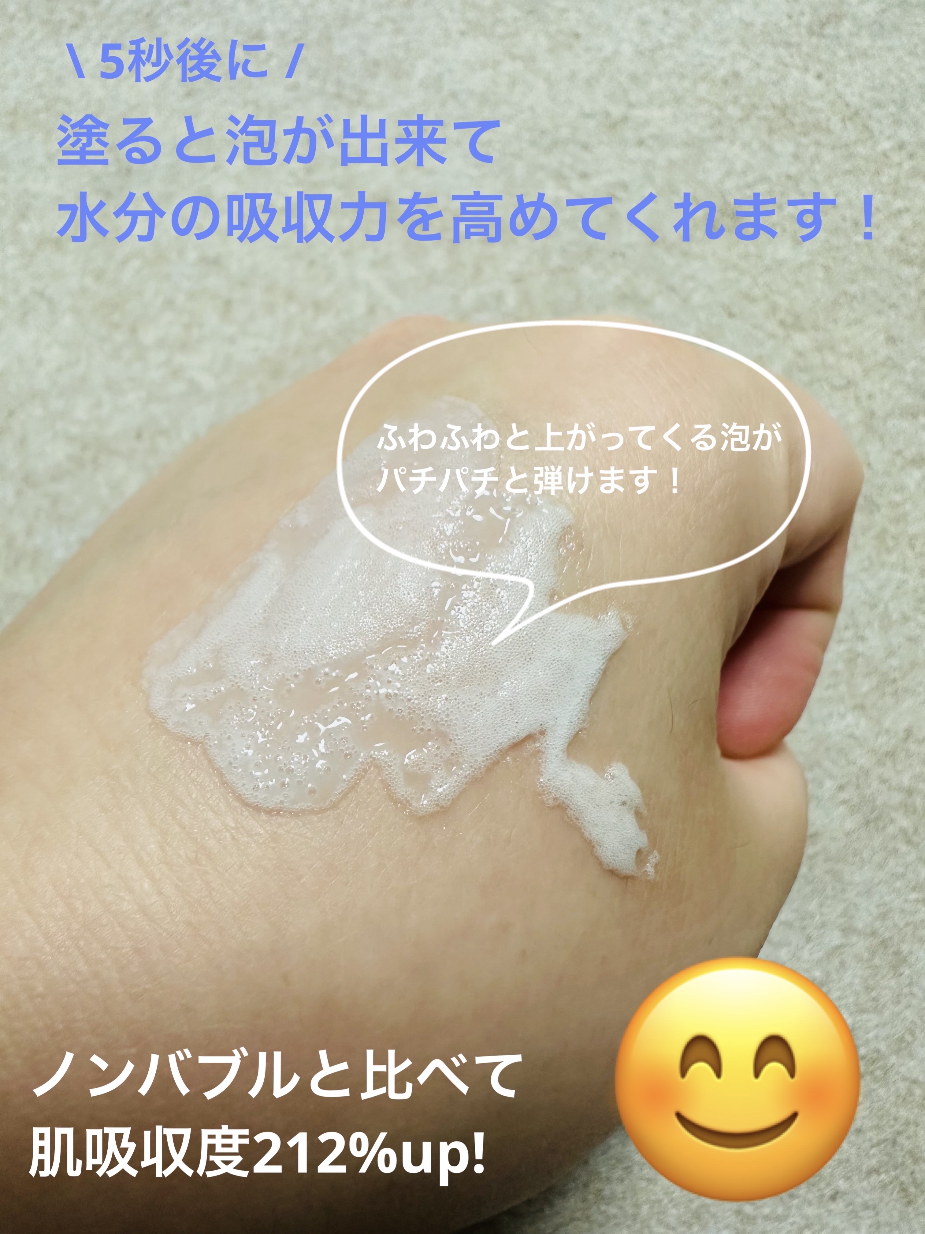| 柔らかい乳液のようなテクスチャーのエッセンスをお肌に塗ると、たちまちしゅわしゅわと泡が出る…!! | 詳細を見る | |||