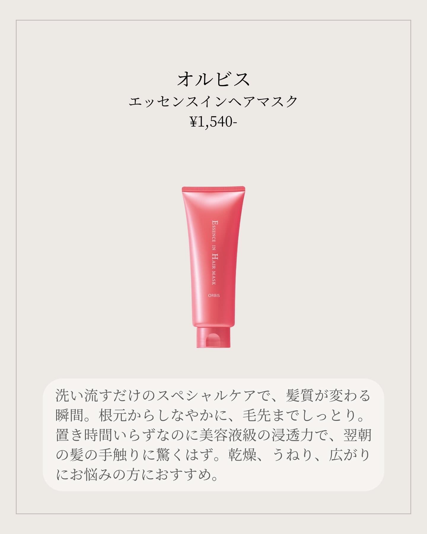 オルビスのヘアミストとヘアミルク愛用してるんですが、ヘアマスクもめちゃくちゃ良かった! 厳選した美容液成分配合! 髪全体に手早く馴染ませやすくて、置き時間なくすぐ流しても良いのが推しポイント! 香がないので手持ちのシャントリにプラスしやすいところもお気に入りです!