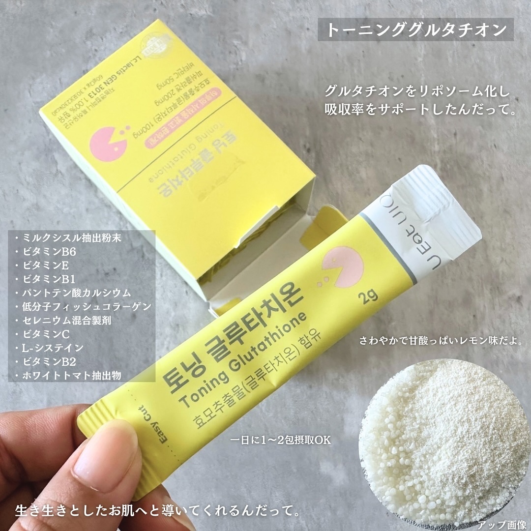 高品質純度85%の韓国産リポソームグルタチオンを配合。優れた技術力を誇る特許乳酸菌Lc.lactisGEN3013も🫶 糖類ゼロだから気にせず続けられて、レモン風味でさわやかに飲めるのも嬉しいポイント😊 1日1包で投入菌数なんと140億CFU😳 計17種の複合乳酸菌を含有しています。
