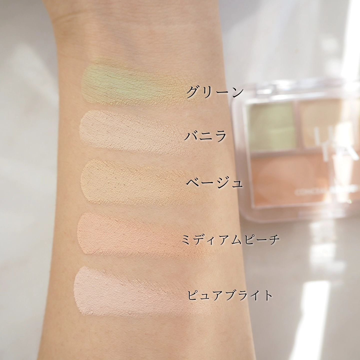 一つのパレットでカバーからカラーコントロールまで! 色んな肌悩みにアプローチする5色のカラーでコスパ最強のコンシーラーパレット 今回使用した1号クリアカバーはイエベ・ニュートラルの方におすすめ! クリーミーなテクスチャーで密着力が高く肌に馴染むのでよれない