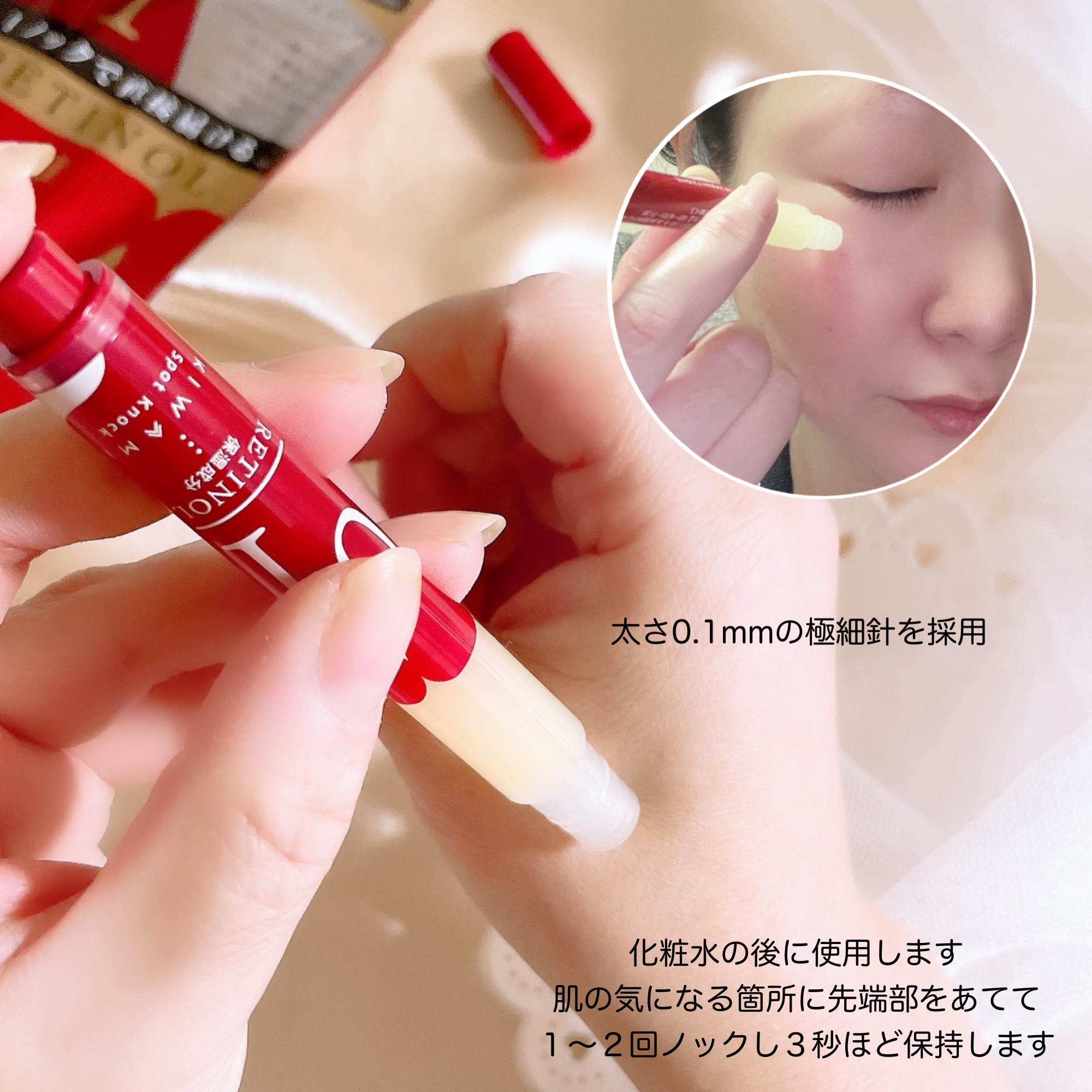 - ★注入型マイクロニードル美容液で角質層に直接注入 気になる目元/口元にノック式ペンタイプ注入器で角質層に直接注入することが出来ます。針は太さ0.1mmの極細針を採用しました。 ★次世代型*1レチノール レチノールとは、年齢肌をケアする整肌成分として今、注目されているビタミンAの1種です。 ・次世代型*1ビタミンA 「グラナクティブ レチノイド」を採用 グラナクティブレチノイドは米国Grant Industries社が開発したレチノイド。 刺激性*2、安定性を追求した次世代型ビタミンAです。グラナクティブレチノイドは直接型レチノイドなので、肌に優しい使い心地です。 繊細な目の下や目尻、首元にも使用することができます。 *1自社比 *2全ての人に刺激が起こらないという訳ではありません