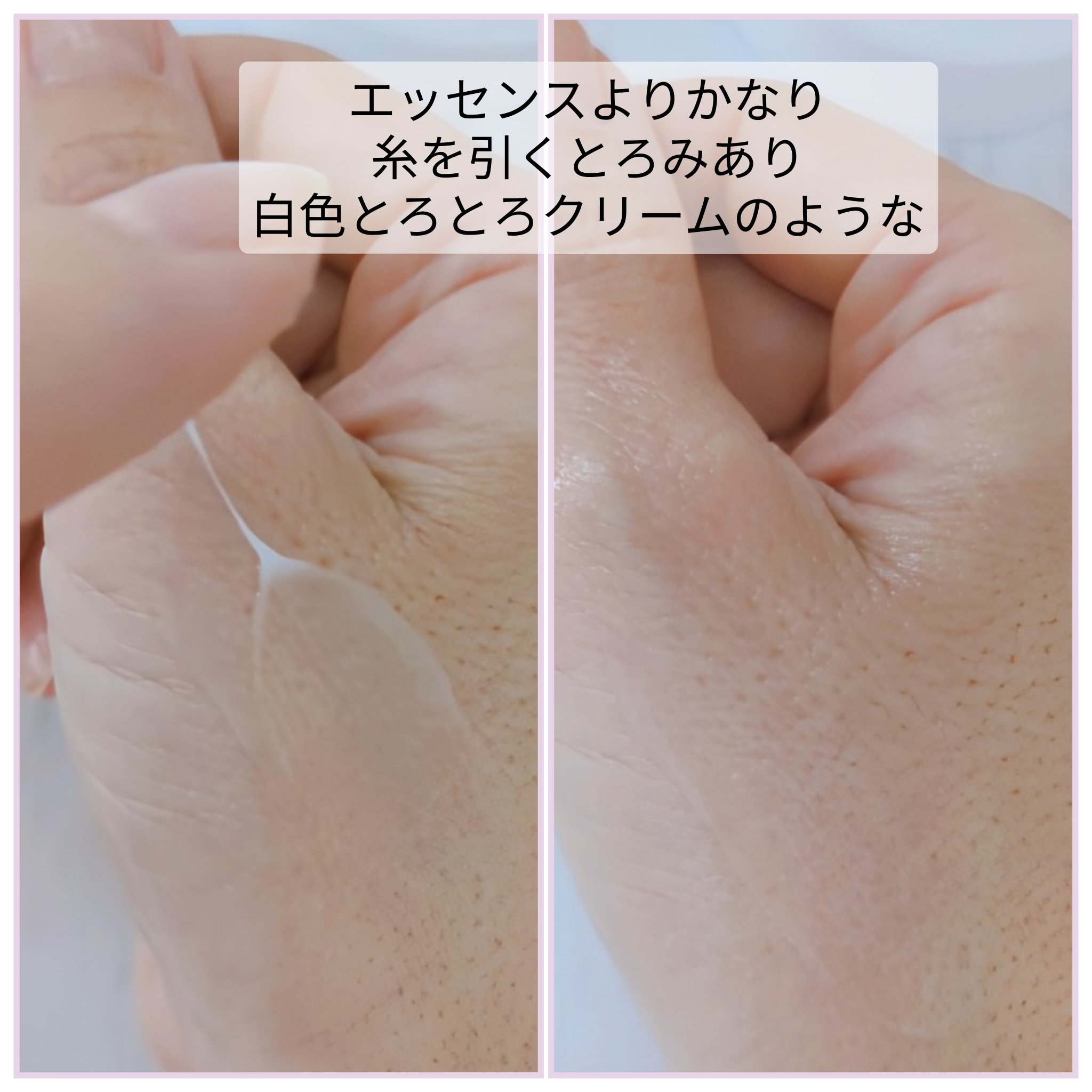 水分たっぷりだけど、糸ひく特徴的なテクスチャー スーッと伸びてみずみずしい付け心地◎ 薄手だけど、美容液ひたひた 10-20分つけてはずします。 とろーん、と糸ひくクリーム。 柔らかく、水分たっぷり!! ぷるぷるテクスチャーで、みずみずしい使用感です🫧