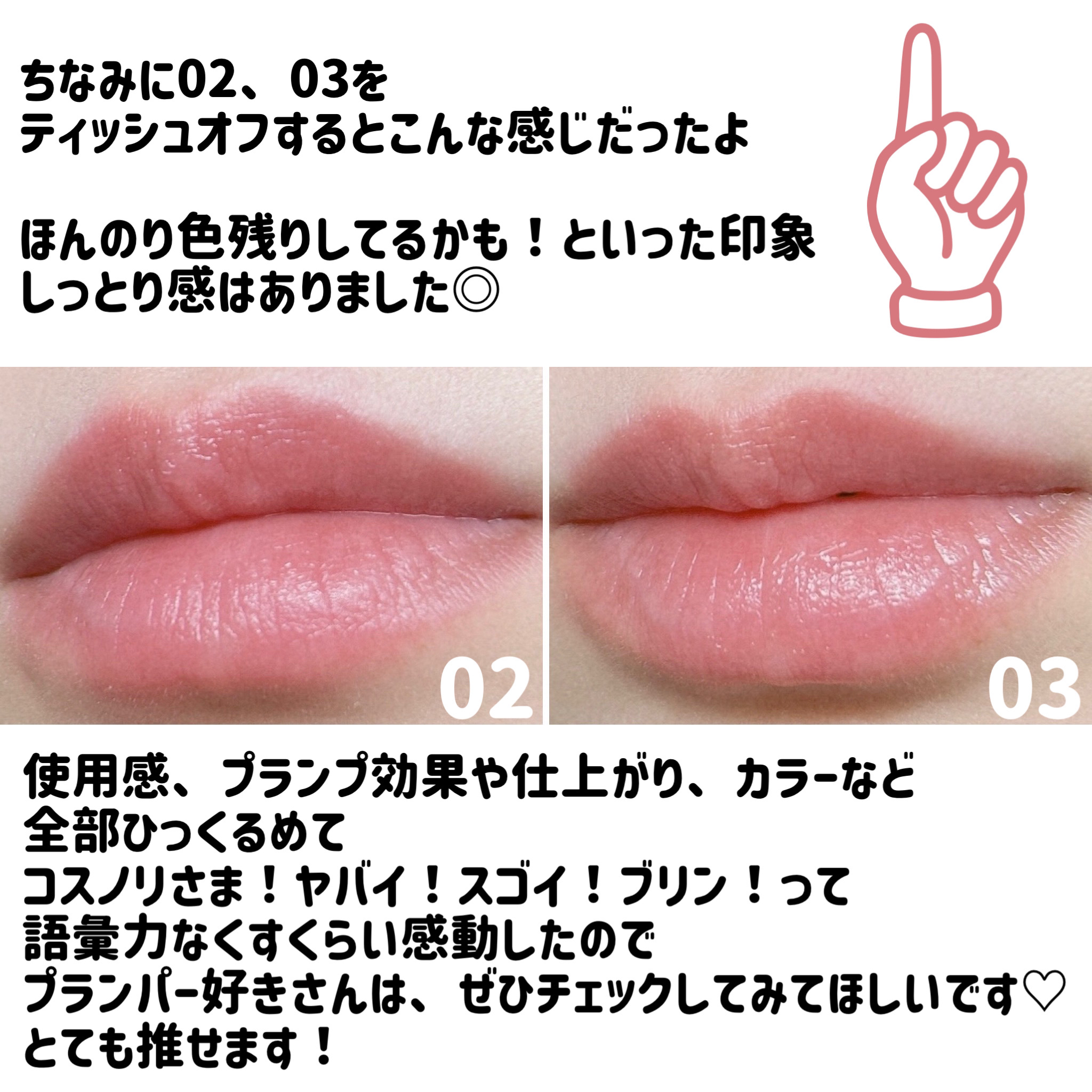 唇のボリュームと血色を活かすクリアな輝き 潤いと栄養を与える ツヤとむっちり感、特に下唇のむっちり感がでて縦じわも目立たない感じ 保湿力もあり色味もキレイなので使い勝手の良いバームだと思いました♡