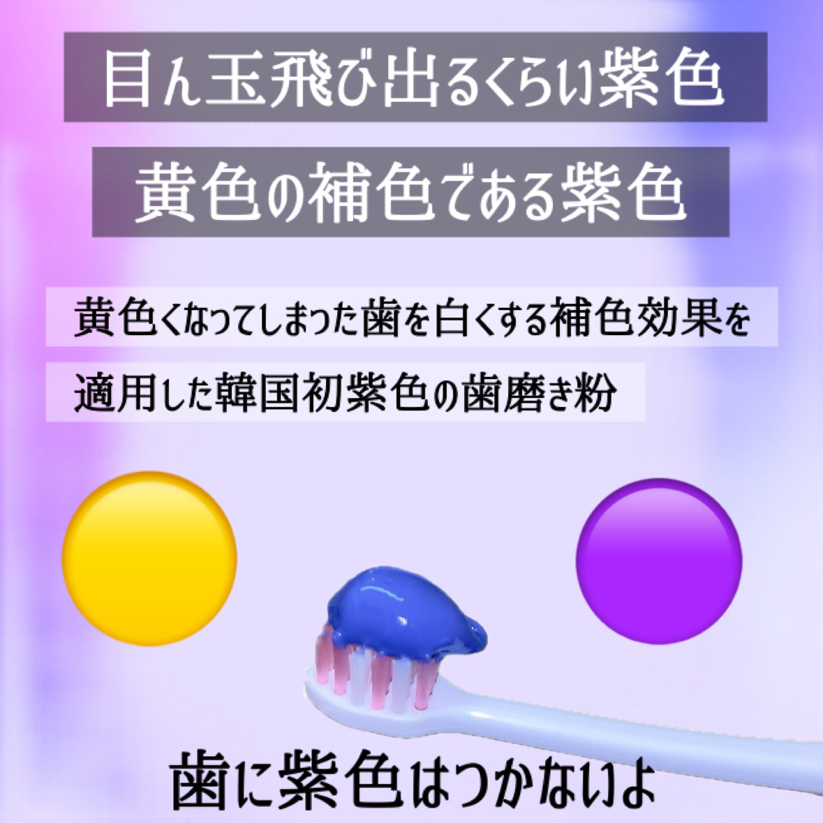 韓国発🇰🇷新発想の歯磨きだけで白くなる 紫ホワイトニング*で歯もトーンアップ! 💜3-STEPのホワイトニングメカニズム 1. スマートホワイトニング粒子が歯の着色汚れを落とす 2. ホワイトニング粒子が吸着し着色汚れを防止 3. 着色汚れ除去と防止により、たった1週間で白くなる歯を実感 たしかに白くなった気がする!すごい😳 結構爽快感のある味わいです💜