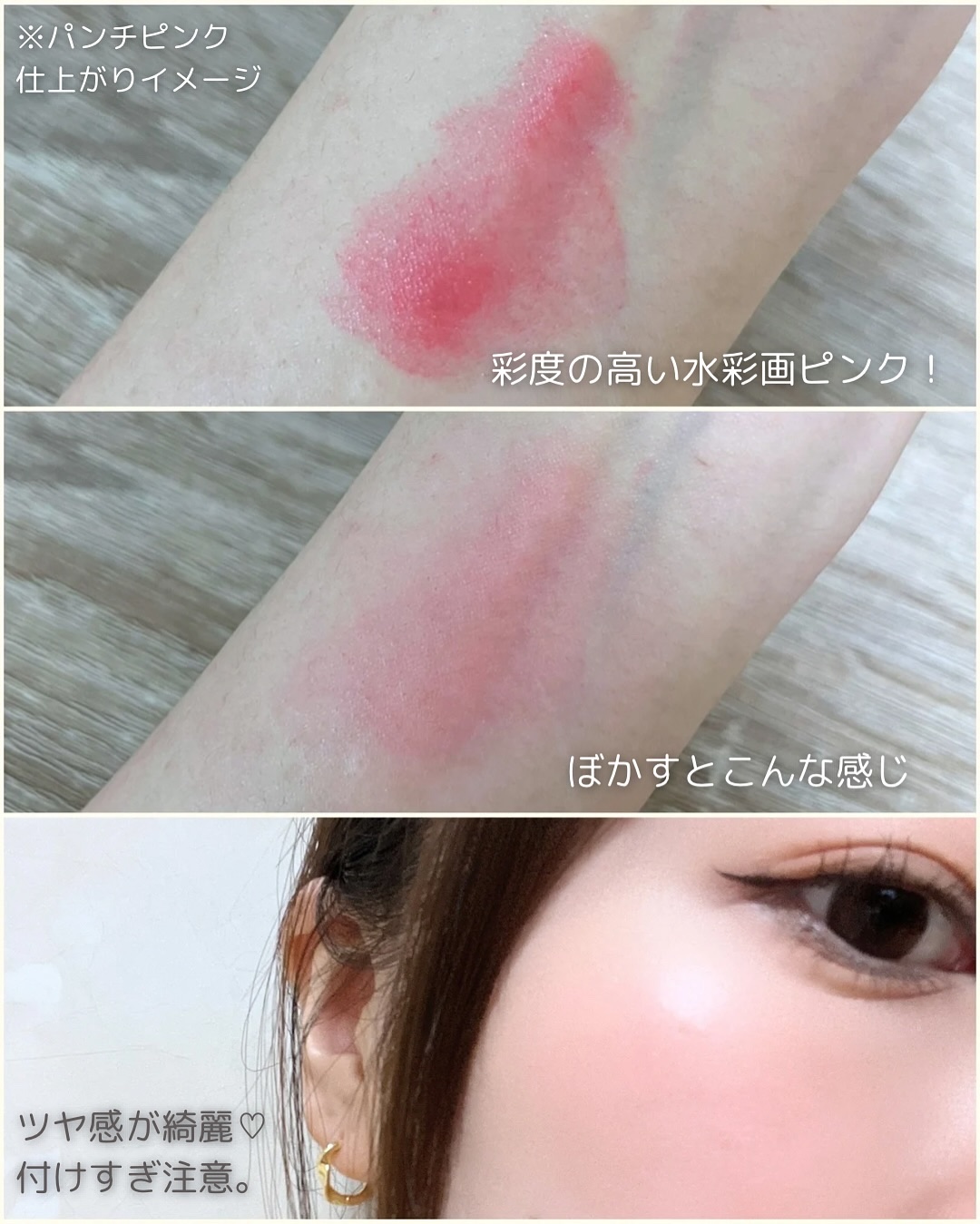 ワンタッチできれいに染まるクリームチーク。 クリーミーなテクスチャーで軽く密着! パンチピンクは彩度の高い水彩画ピンク🩷 顔に血色感や活気をUP! 毛穴詰まりや化粧ヨレもせず長時間発色キープしてくれるよ😊