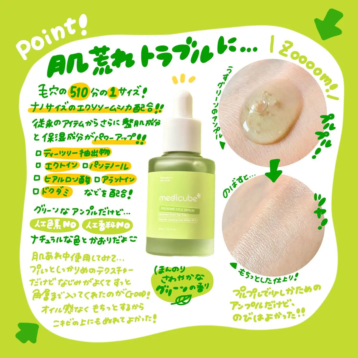 エクソソームで肌の鉄壁防御💪🏻🍃 新商品のエクソソームシカ4種 メディキューブのエクソソームシカは5.3倍強く 毛穴の510倍小さく毛穴にの隅々まで届く🍃 高濃縮な緑のジェルテクスチャー だけどサッパリしてベタつかないならデイリー使いにもオススメ🙆🏻♀️🍃🍃🍃