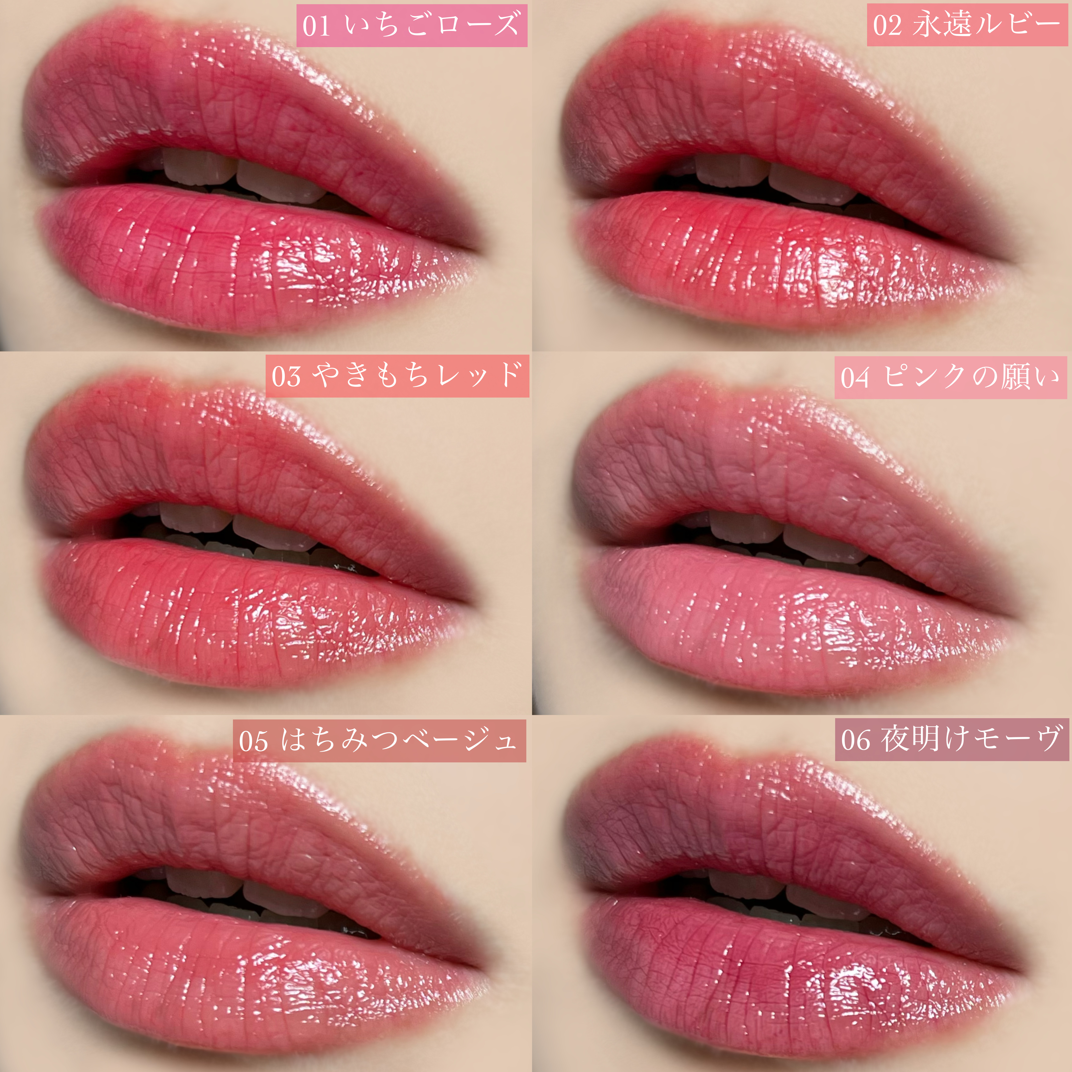 - ・じゅわっと透明感*¹ ある美発色 ティントでありながらも自然なリップカラーを演出。 見たまま美発色で唇を彩り、グロウなテクスチャーでありながらカラーフィクシングが可能。 ・ひと塗りでボリューム感*¹ と、とろける光沢感を演出 独自成分*² により反射光を効果的に演出し、唇の皺を見えにくくする。 また、モイスチャー感と光沢感もキープし、生ツヤっぽい光沢感を演出。 ・クリアなレイヤリングカラー 厚みのない、塗れば塗るほどきれいな発色。 ヌーディ系のライトとミュートカラー展開。 *¹ メイクアップ効果 *² アルミナ成分