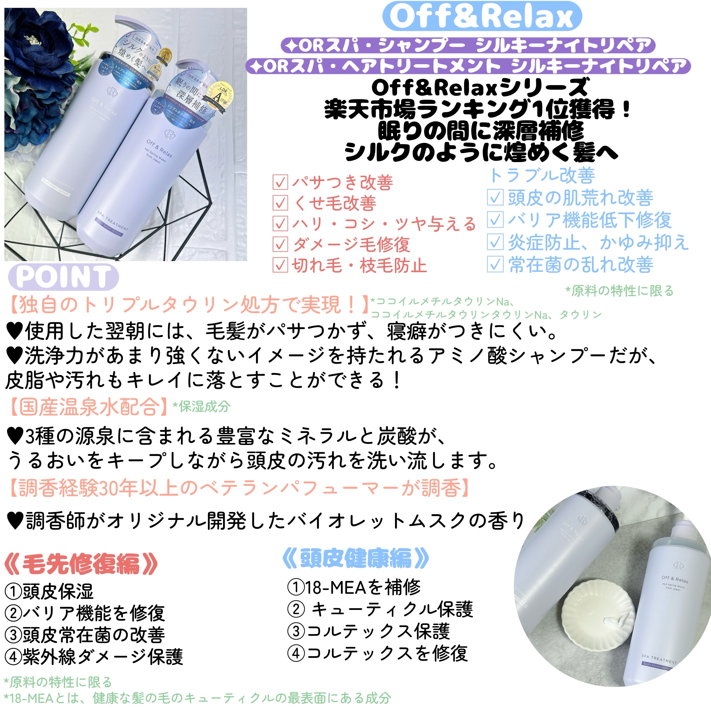 商品詳細情報Off&Relax OR スパ・シャンプー/ヘアトリートメント シルキーナイトリペア