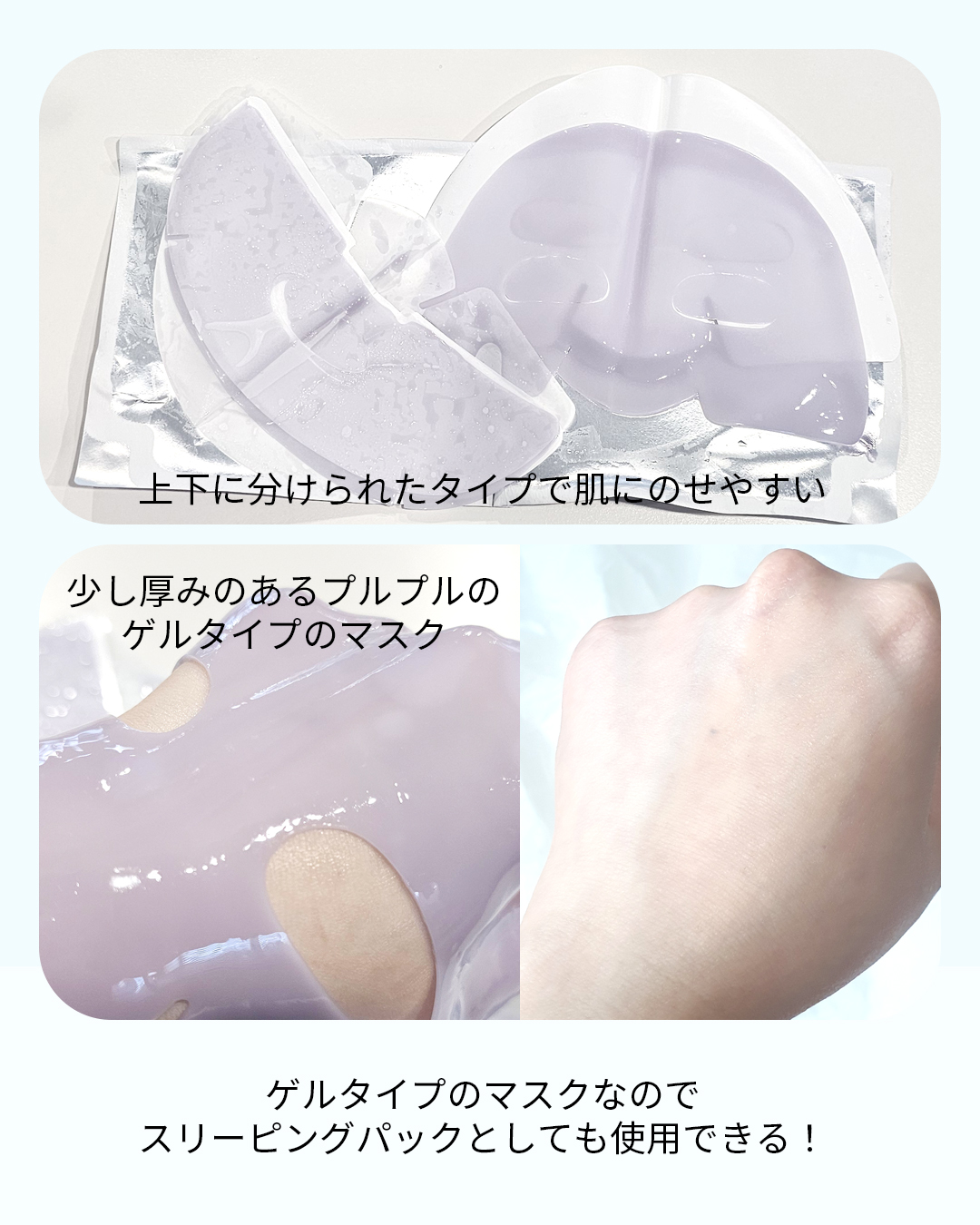 | ぷるんぷるんのゲルマスクで、上下が分かれているタイプ!貼りやすいし密着力も高いよ🤩 | 詳細を見る | |