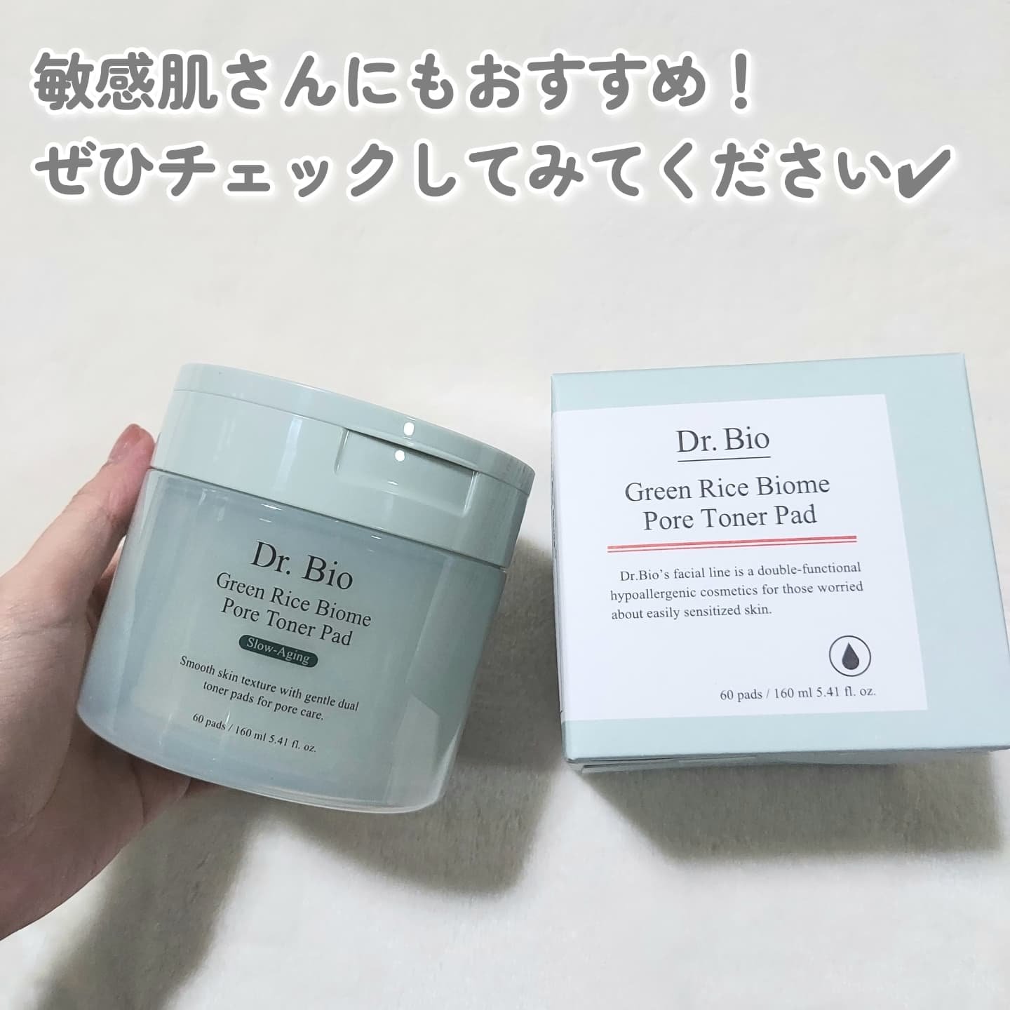 Dr.Bio緑米バイオーム™トーンアップ毛穴トナーパッドを使用しました。老廃物ケアからキメケアまで、緑米成分と乳酸菌で低刺激なスキンケアが叶うトナーパッド。乳酸菌は肌のバリア機能にアプローチしてくれるそうです。パッドは2分割して顔の細かい部分...