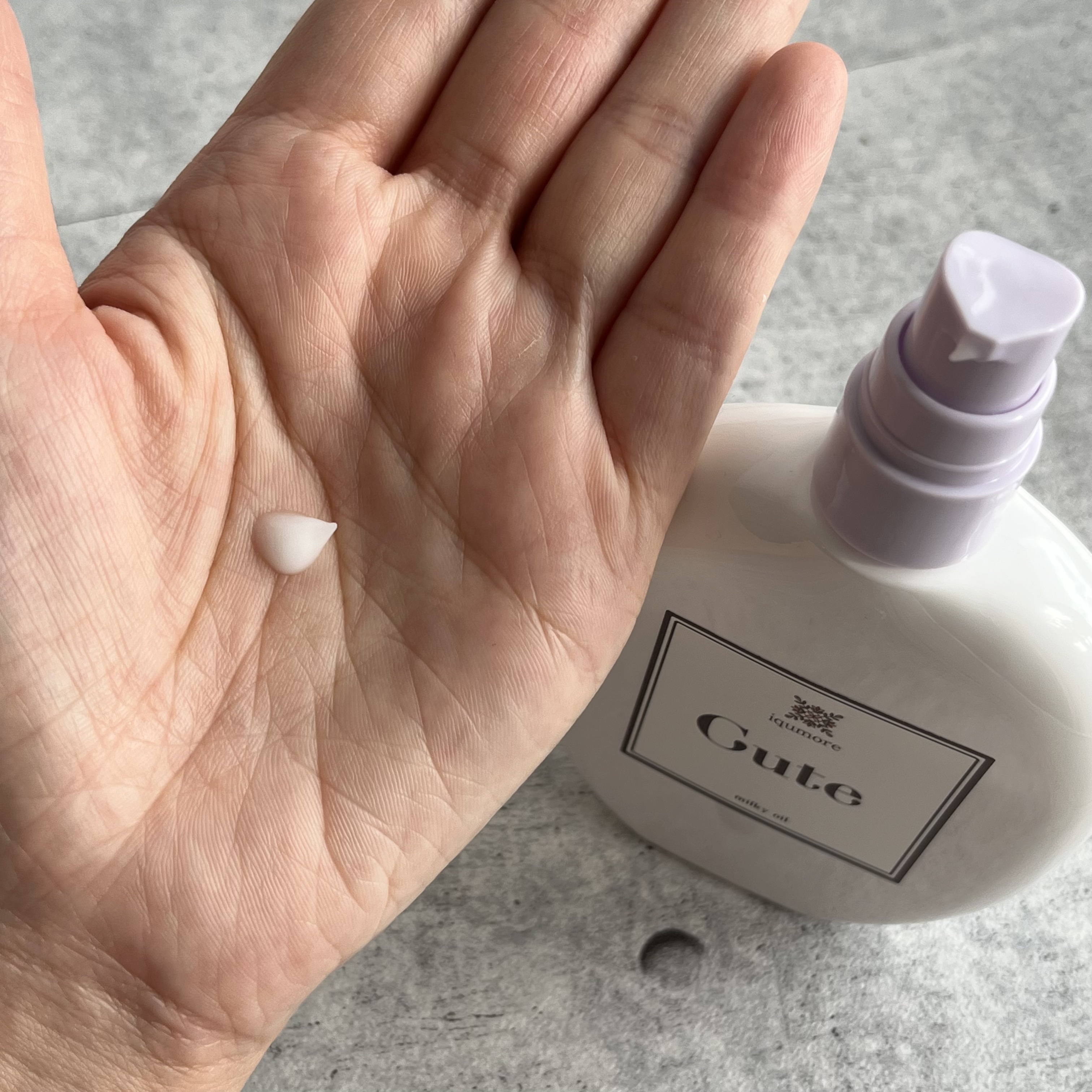 イクモアキュート ヘアケアエッセンスの96.5%は天然由来成分でできているそうです。ノズルを回して直接塗布できます。サラっとしてべたつきもないです。 髪の内部に潤いを与えながらダメージ髪を補修し、表面をコーティングすることで色落ちを抑えるヘアマスク。爽やかで華やかなアールグレイティーの香り。 べたつかないのにうるおいを感じる、柔らかくスーっとなじむテクスチャ。みずみずしい乳液のようなテクスチャーで伸びが良く、髪になじみやすいです。