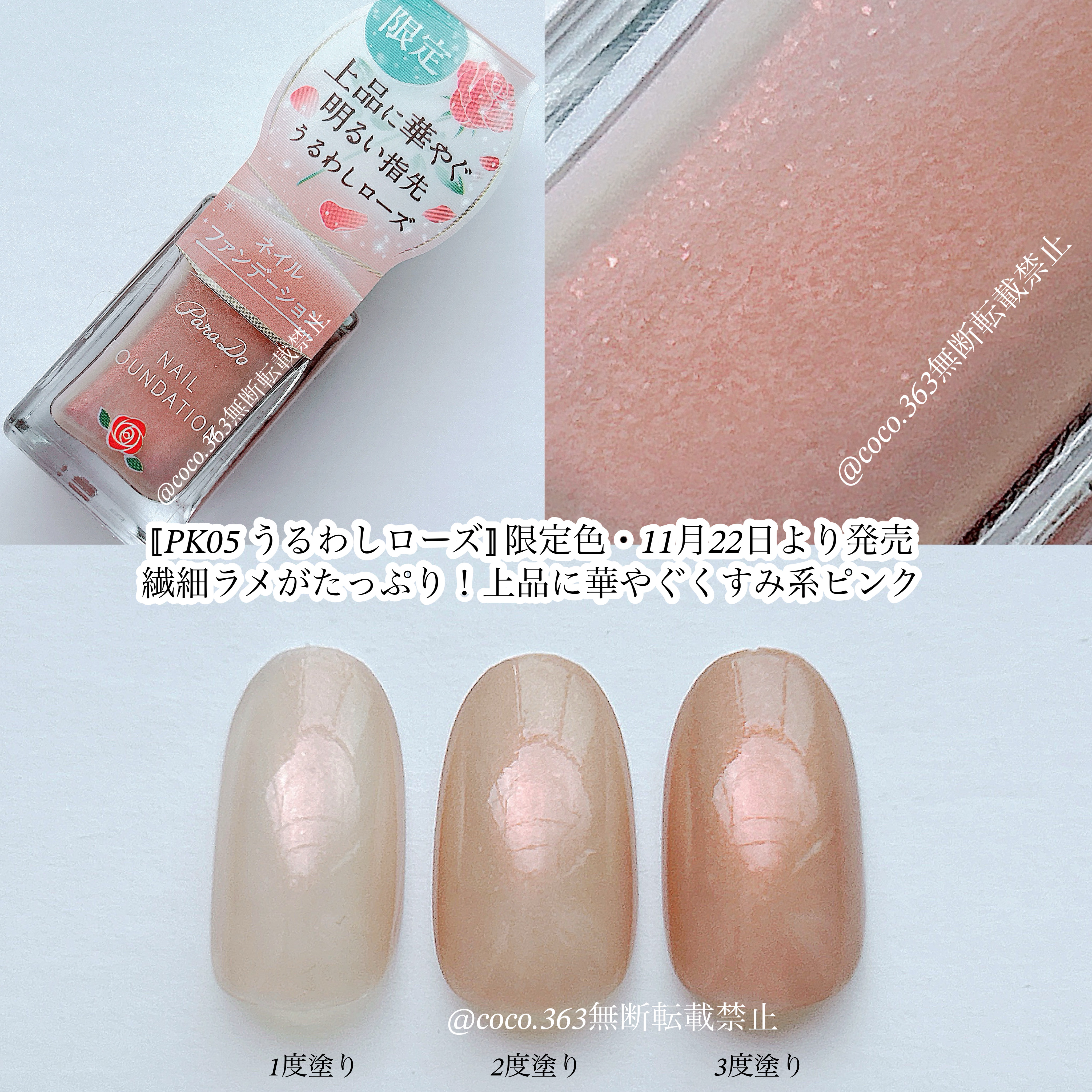 品よく華やかな仕上がりが魅力の 限定色〈PK05 うるわしローズ〉が登場! うるわしローズのバラ色のラメとミニネイル〈化け猫〉の猫ヒゲラメが相性抜群で、指先に大人の遊び心をプラス💅✨ 11月22日(金)セブンイレブンにて発売ネイルファンデーション限定色「PK05 うるわしローズ」¥550(税込)