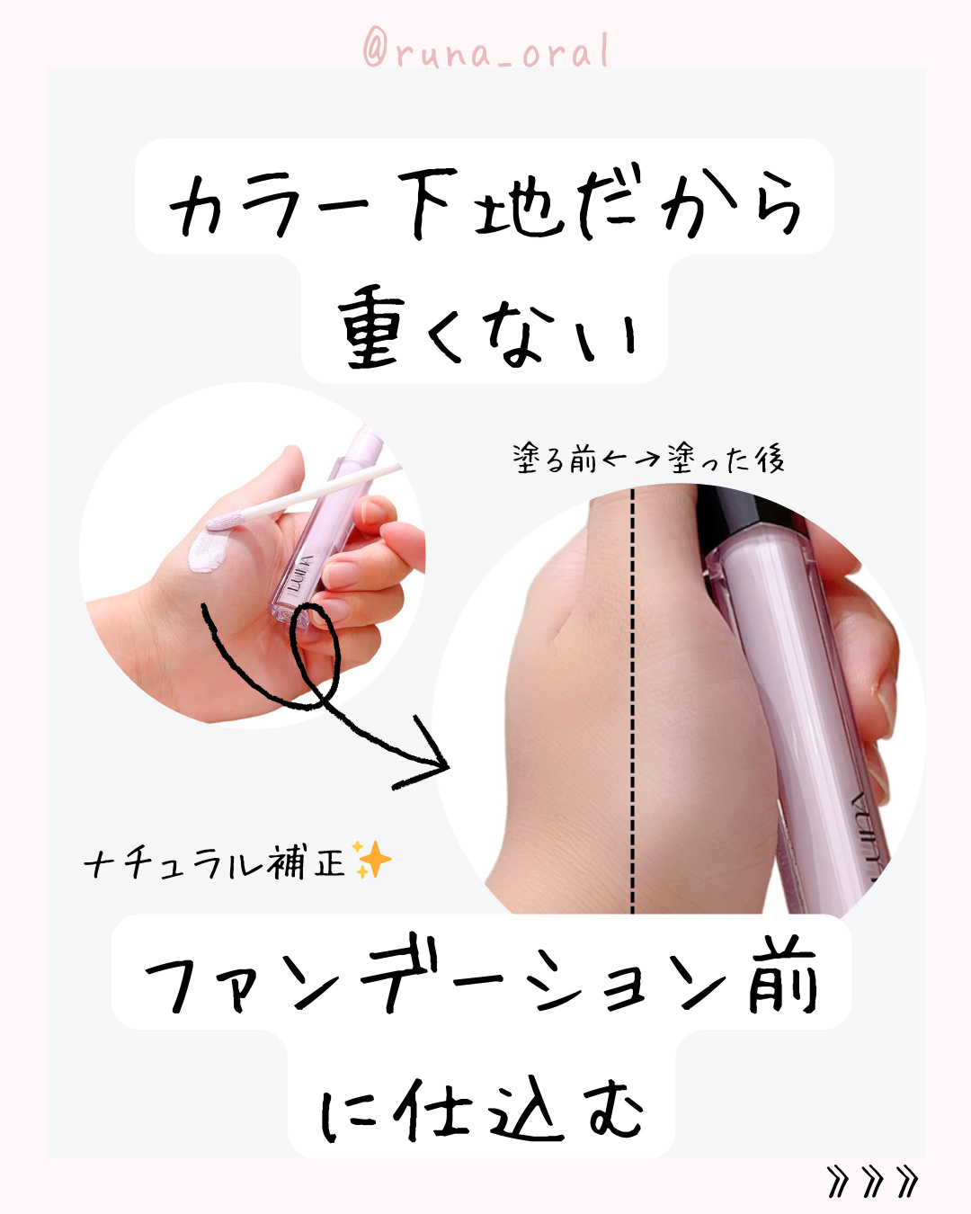 - しっとりとしたテクスチャーの肌色補正下地。 ファンデーション前に使用することで肌色の悩みをカバーし、ナチュラルで明るい印象のベースメイクに仕上がります。 コンシーラータイプなのでかさばることなく、お化粧直しにもピッタリです。 <01 ミントグリーン> 小鼻・頬の赤み・ニキビ跡・赤いシミをカバーするホワイトベースのさわやかなやさしいグリーンカラー <02 ピュアラベンダー> 黄ぐすみをカバーし透明感をプラスするホワイトベースのピンクとパープルが混ざり合ったラベンダーカラー <03 サーモンベージュ> 青黒いくすみや濃いクマをカバーしヘルシーさをプラスする薄いオレンジベースの明るいサーモンベージュ