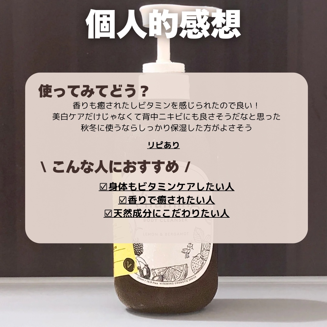 Vitamingのリフレッシングボディソープ試してみまし🍋✨Vitamingというブランドさんは大切な栄養素である『ビタミン』を身近にフォーカスされているそう✨お顔にビタミン!は、わかるんだけど、身体にビタミンってあんまり考えた事なかったかも...