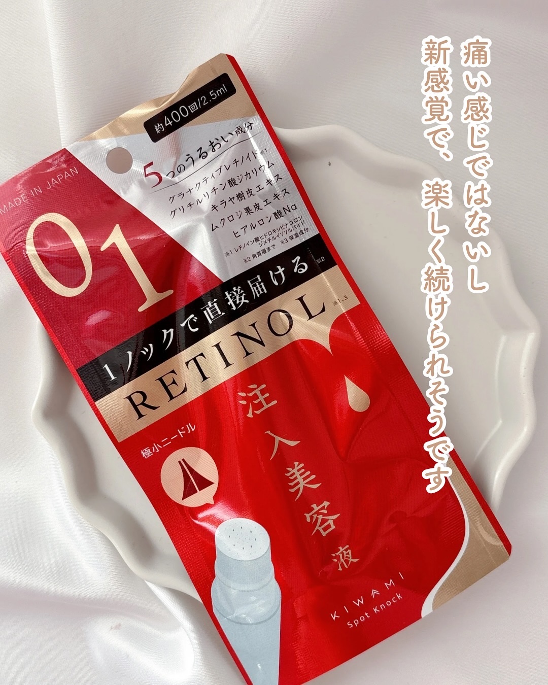 - ★注入型マイクロニードル美容液で角質層に直接注入 気になる目元/口元にノック式ペンタイプ注入器で角質層に直接注入することが出来ます。針は太さ0.1mmの極細針を採用しました。 ★次世代型*1レチノール レチノールとは、年齢肌をケアする整肌成分として今、注目されているビタミンAの1種です。 ・次世代型*1ビタミンA 「グラナクティブ レチノイド」を採用 グラナクティブレチノイドは米国Grant Industries社が開発したレチノイド。 刺激性*2、安定性を追求した次世代型ビタミンAです。グラナクティブレチノイドは直接型レチノイドなので、肌に優しい使い心地です。 繊細な目の下や目尻、首元にも使用することができます。 *1自社比 *2全ての人に刺激が起こらないという訳ではありません