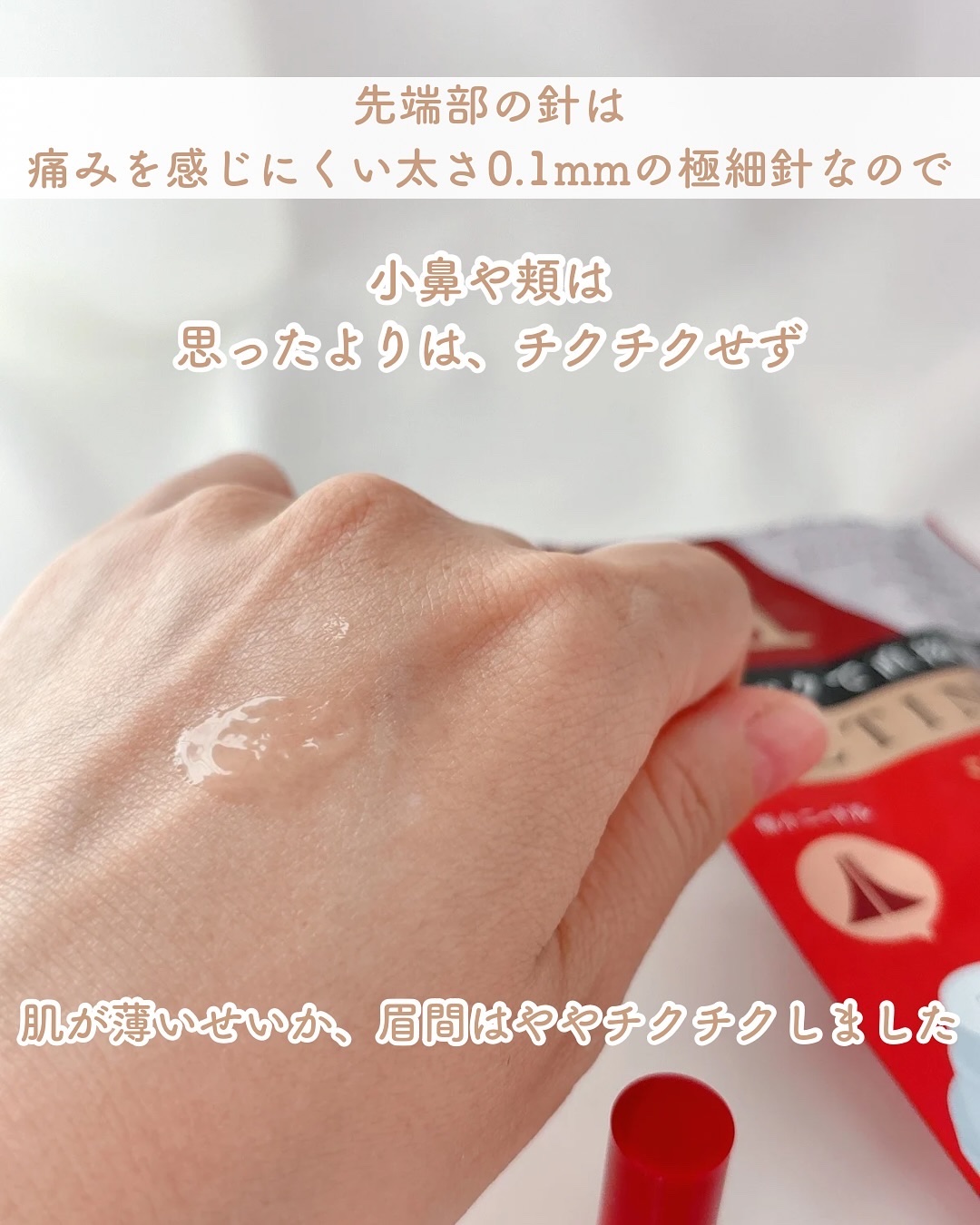 医療機器メーカーが製造したペンタイプ注入器🖋 ノックすると先端部のニードルから保湿成分 (グラナクティブレチノイド)が出てくる仕様🫢 グラナクティブレチノイドは刺激性*、安定性を向上させた次世代型ビタミンA✯*・ 直接型レチノイドなので肌に優しく、効果を体感できるそう😌 針は痛みを感じにくい太さ0.1mmの極細針🪡 気になる部分に先端部をあてて、プッシュし3秒待つよ⏰